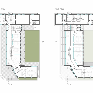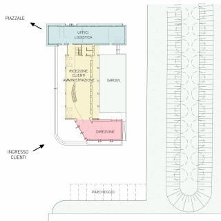 Nel corpo di fabbrica attestato sul parcheggio interno, sono ubicati l’ingresso riservato ai clienti e tutti gli uffici della dirigenza. Nel corpo centrale, la facciata interamente in vetro illumina un open space a doppio volume destinato ad accoglienza clienti; dalla scala a ventaglio si accede al piano superiore realizzato su un solaio metallico letteralmente appeso alla struttura ad arco della copertura. Un ballatoio affacciato sul doppio volume, dà accesso agli uffici amministrativi del piano primo, a loro volta affacciati sul giardino retrostante e quindi protetti dai rumori e dalle polveri originati dal piazzale.