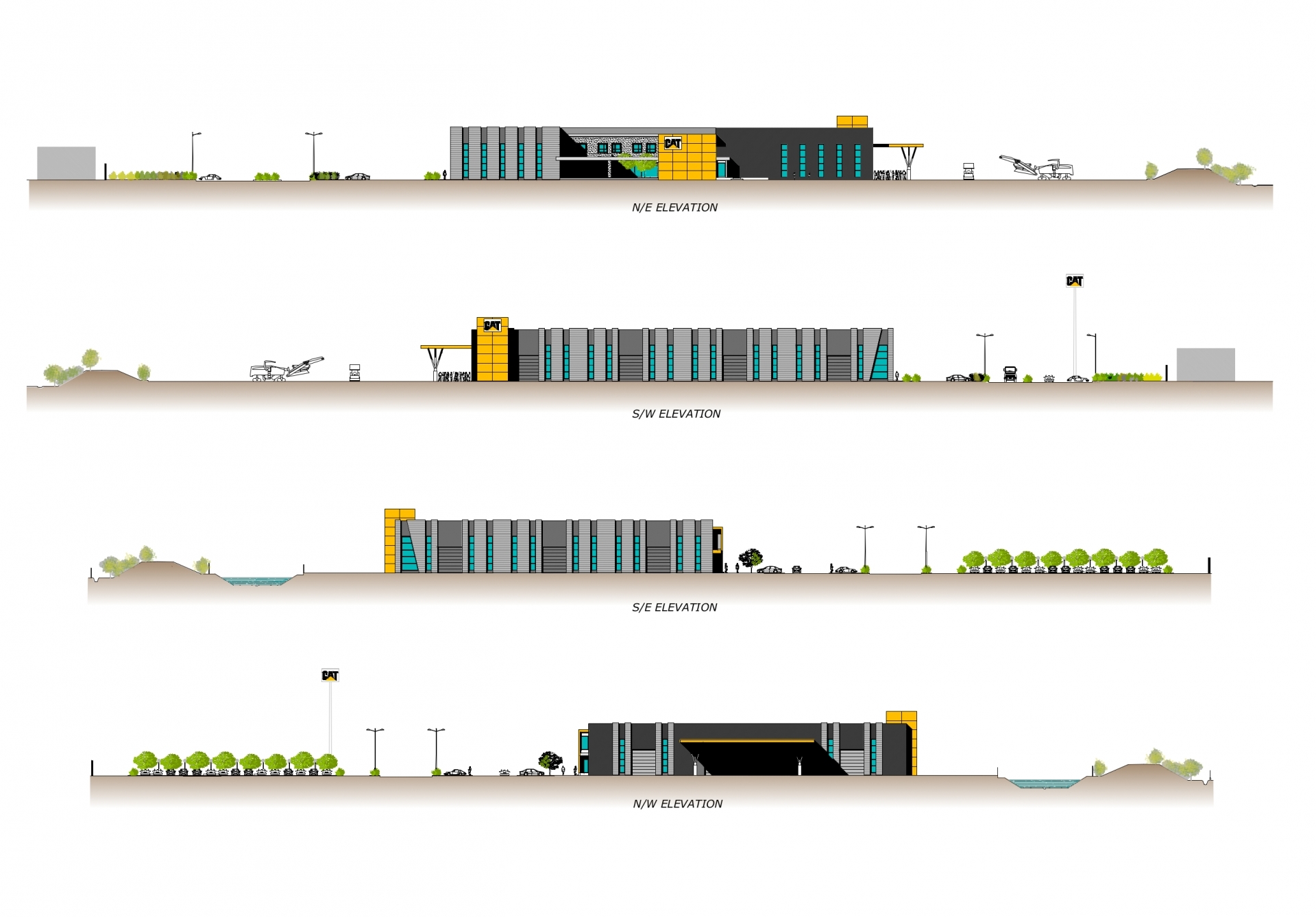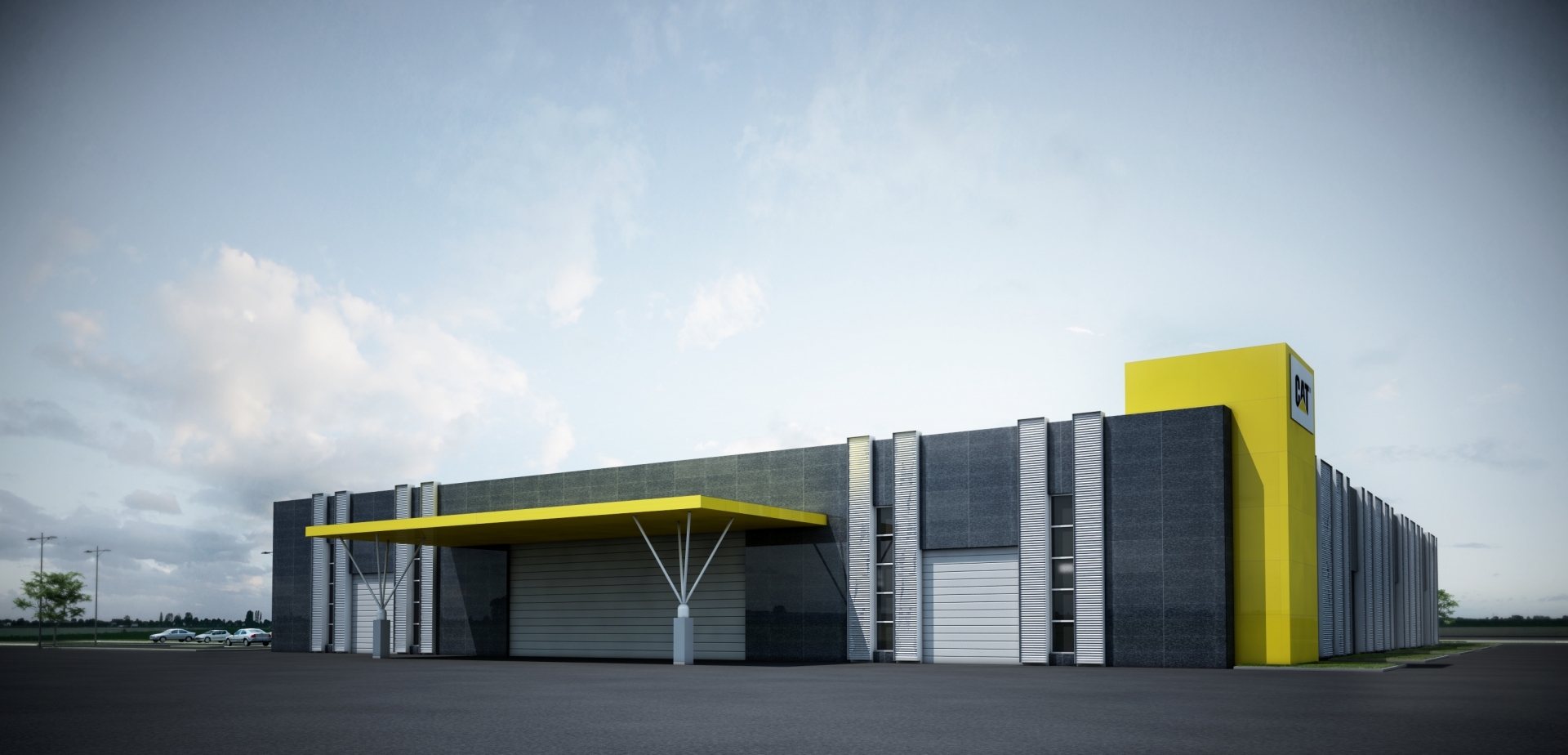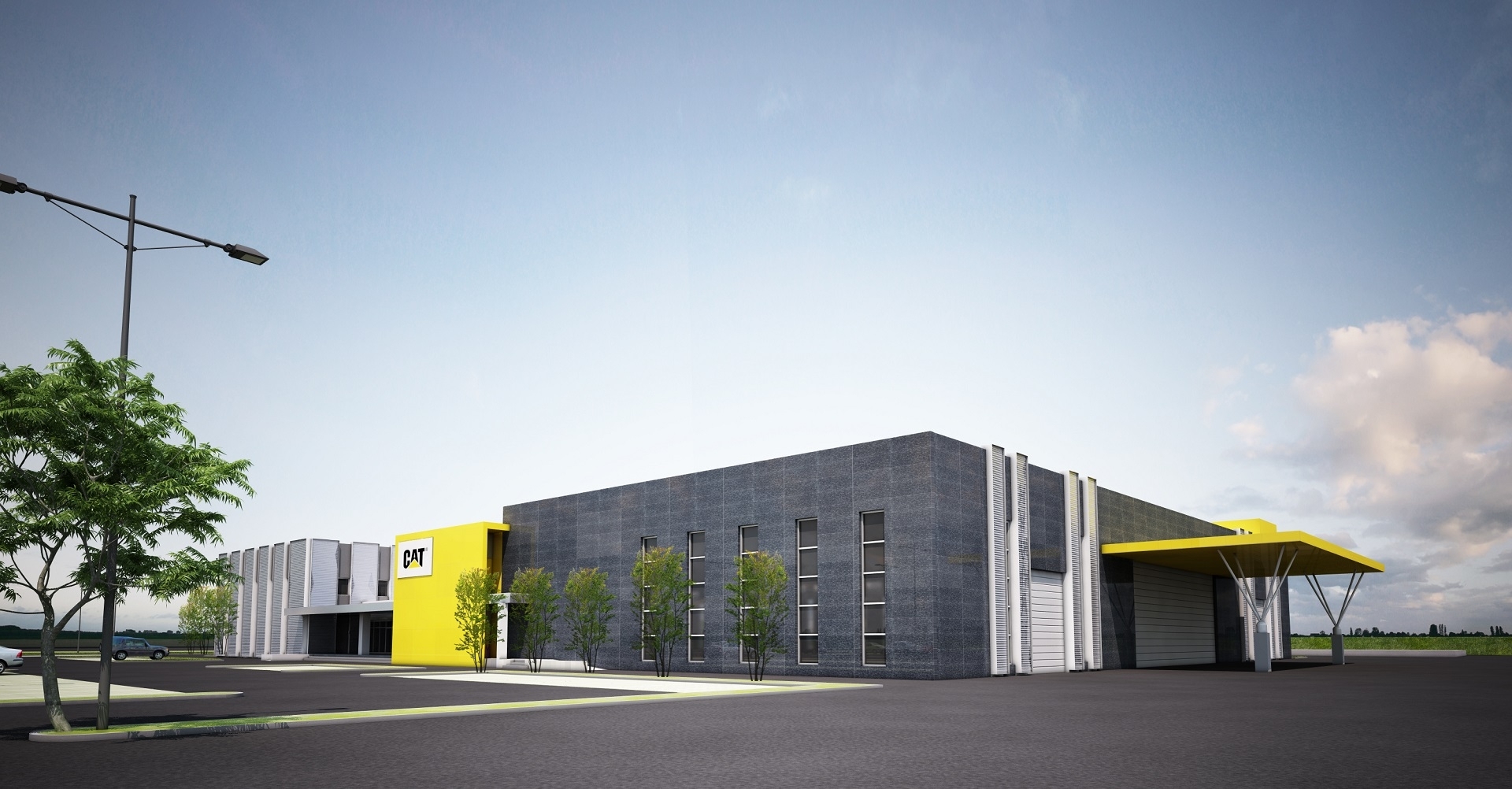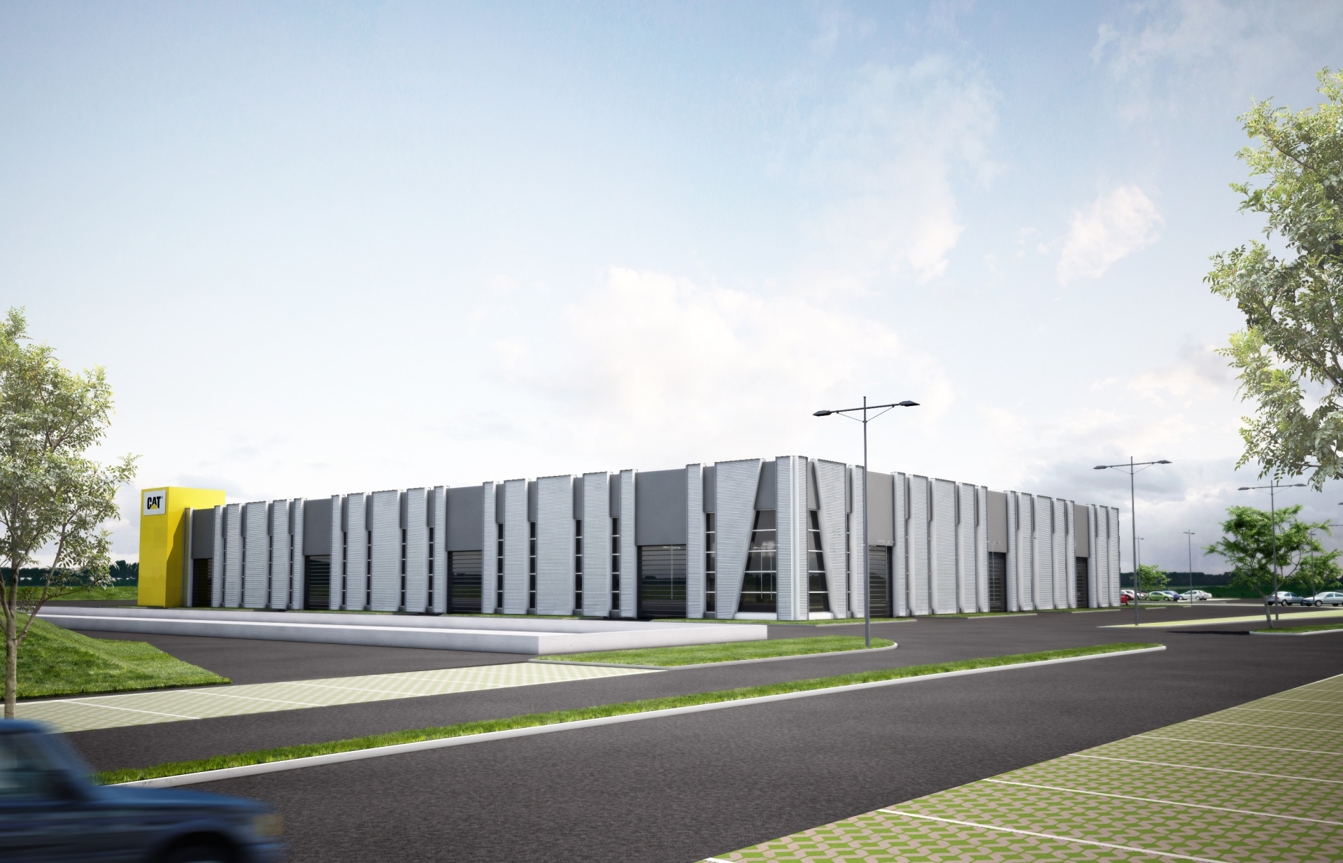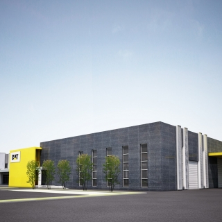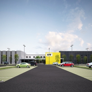 Nell’area esterna di 40.000 mq. sono previste ampie aree verdi, parcheggi per circa 350 auto, l’area per la prova delle macchine Caterpillar.