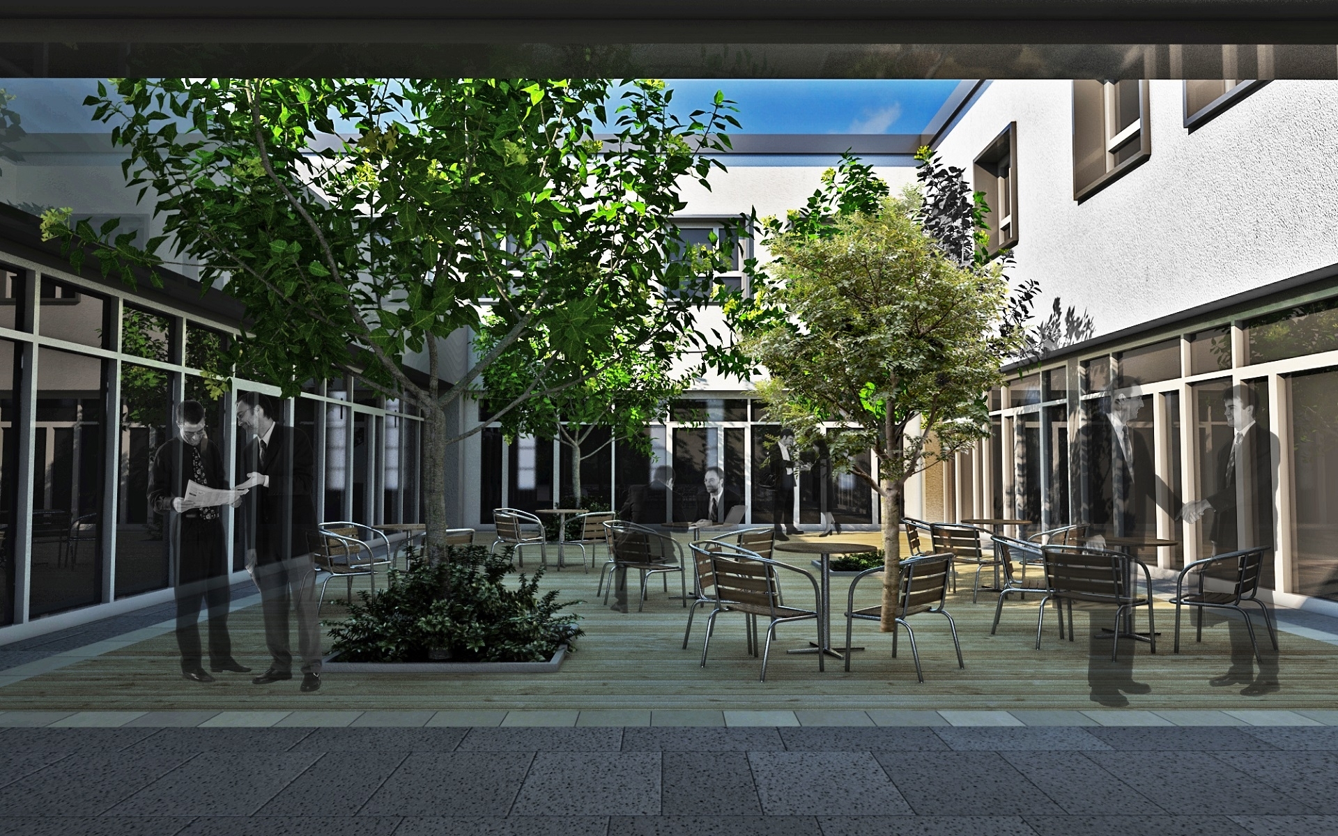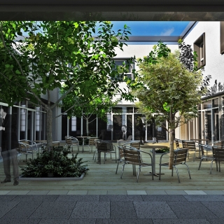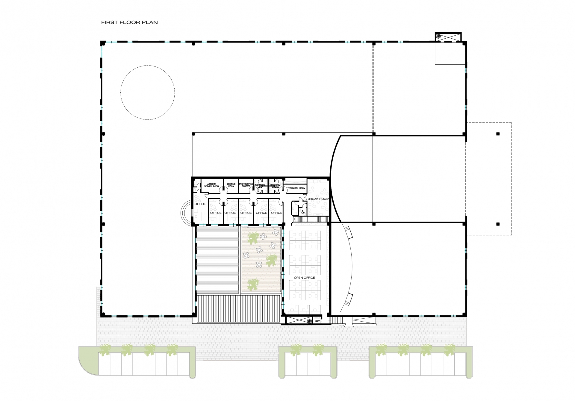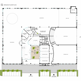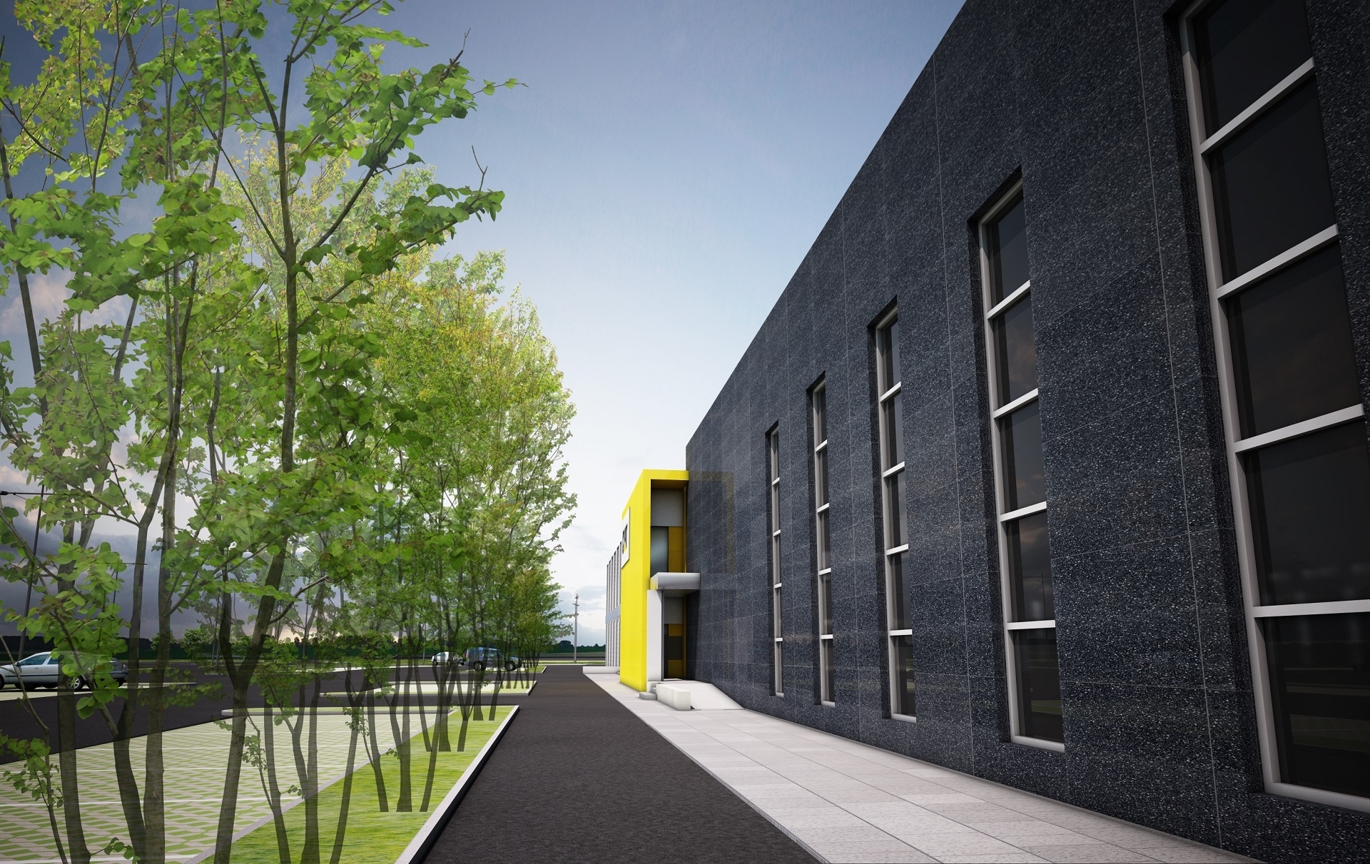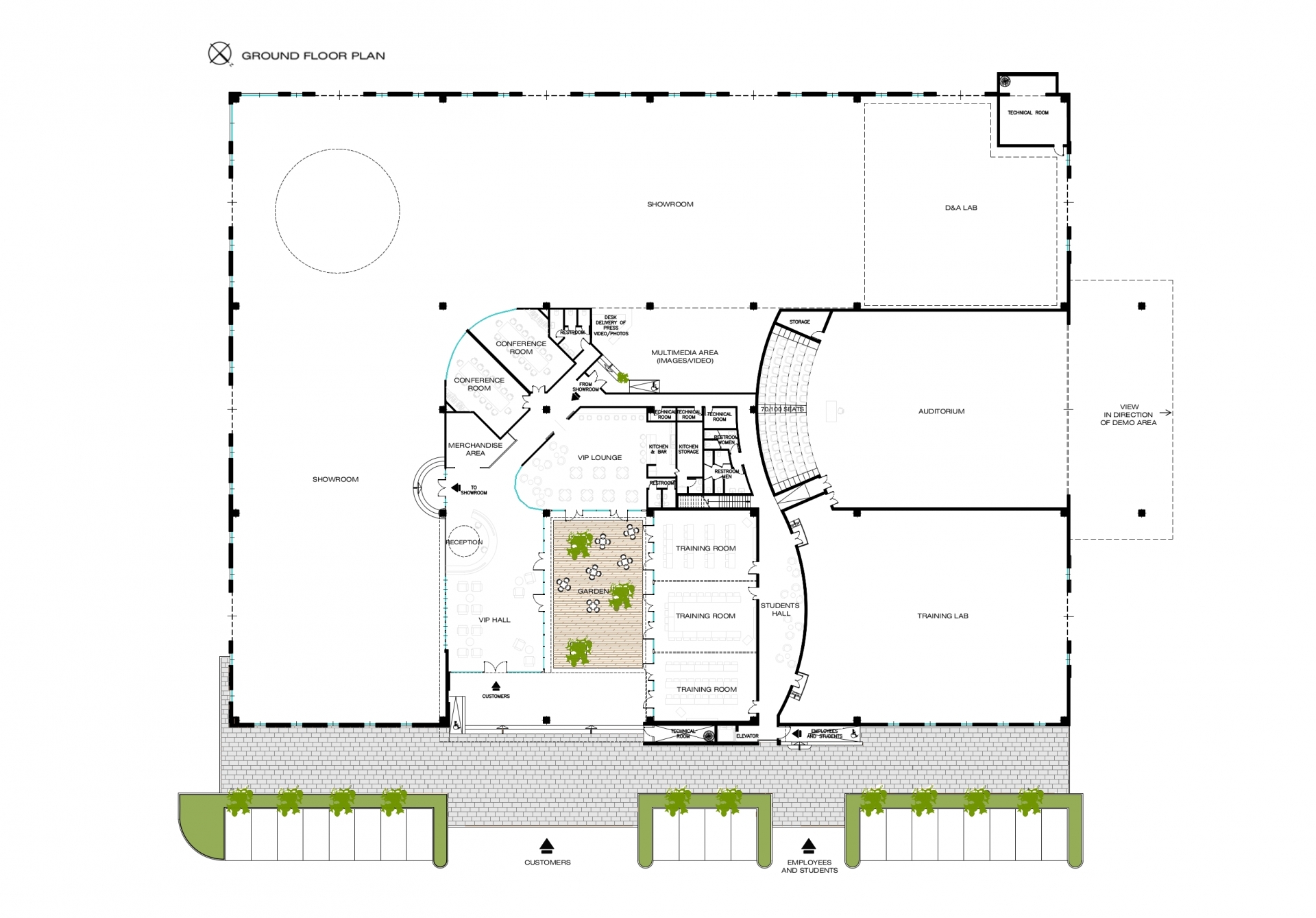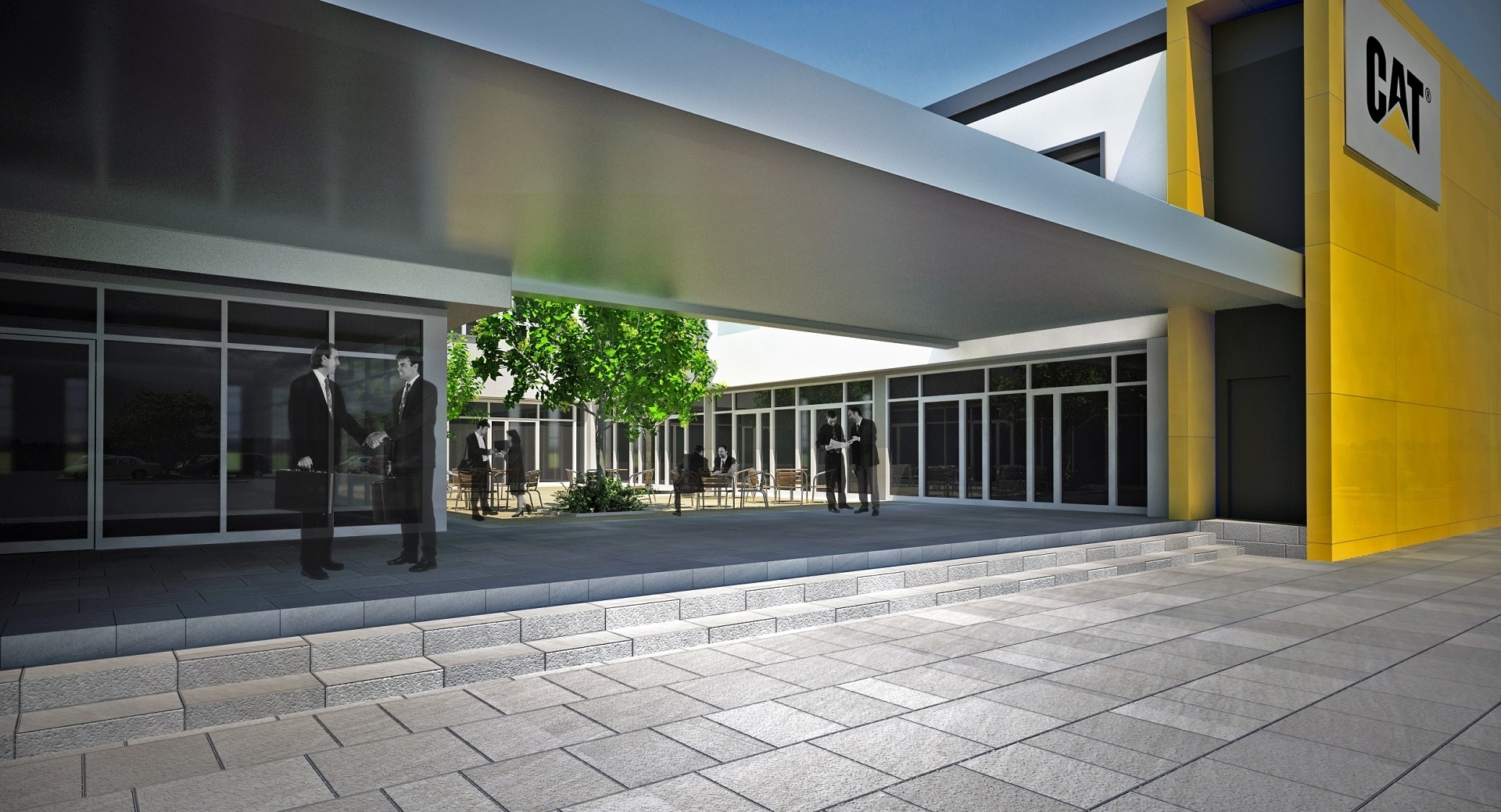 Nell’area esterna di 40.000 mq. sono previste ampie aree verdi, parcheggi per circa 350 auto, l’area per la prova delle macchine Caterpillar.