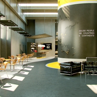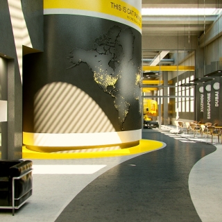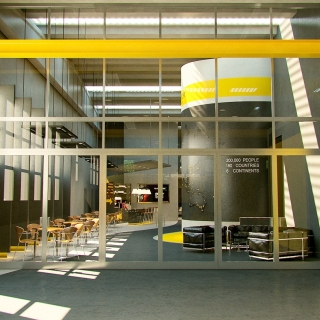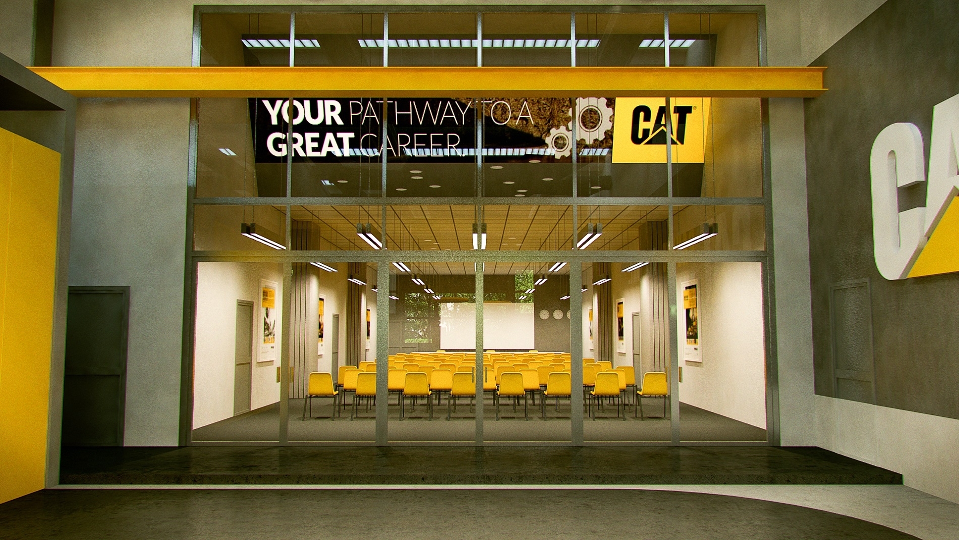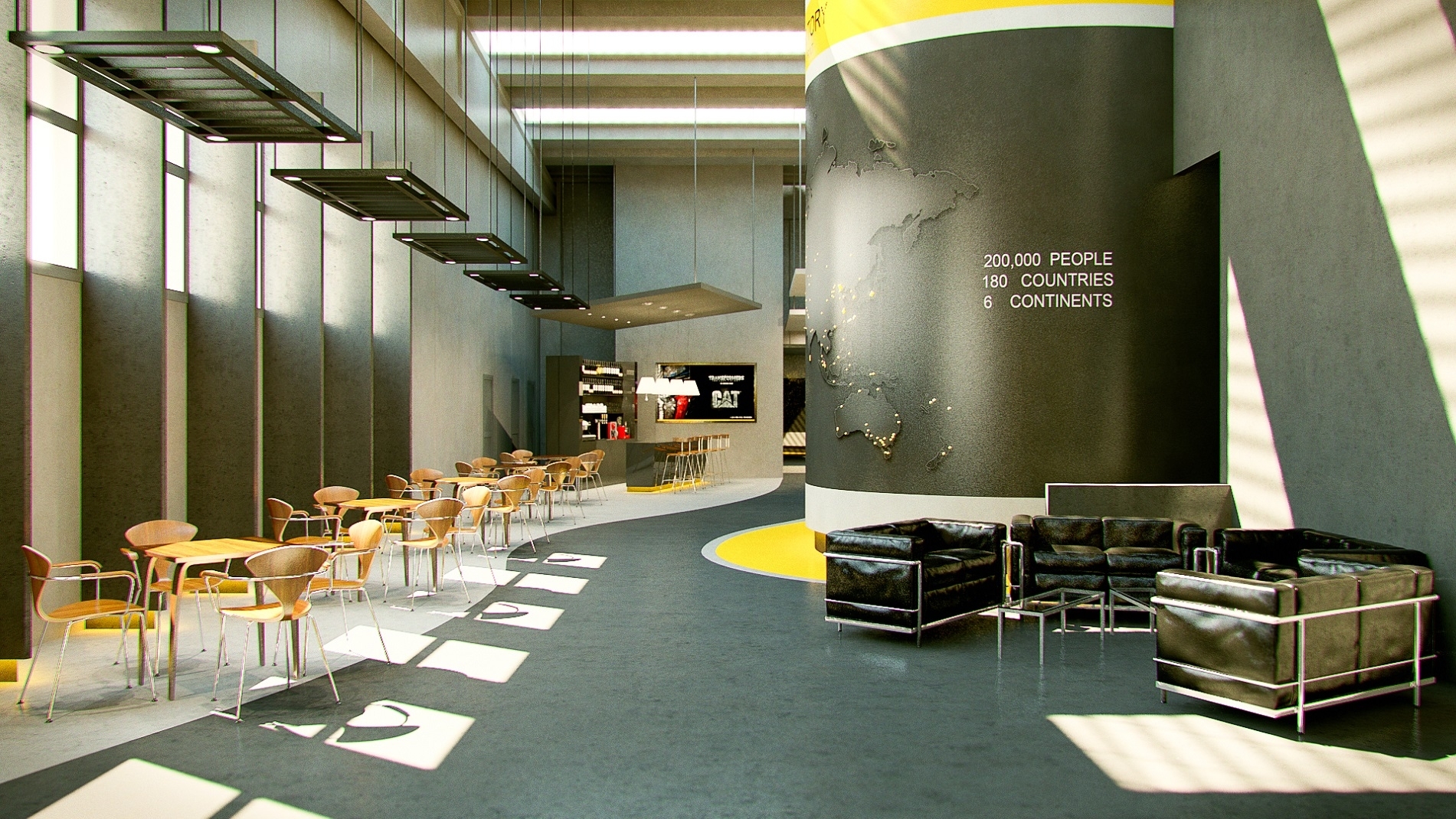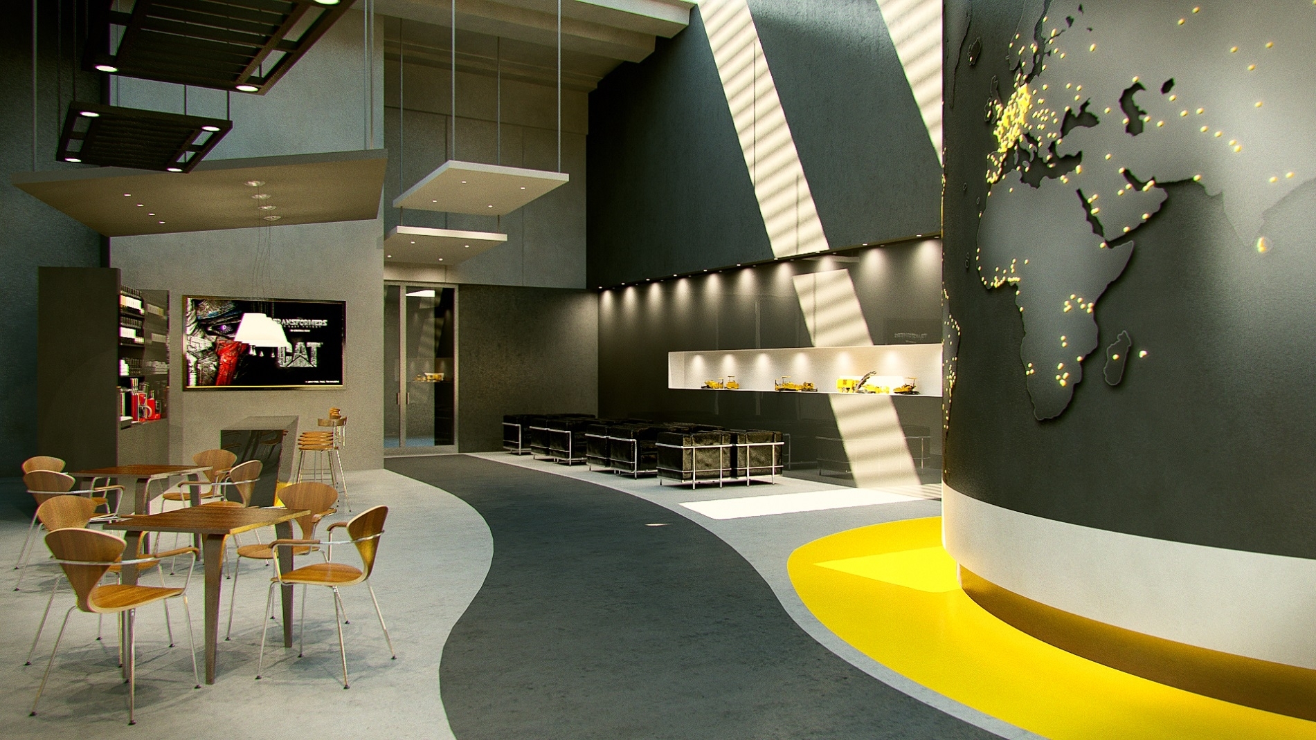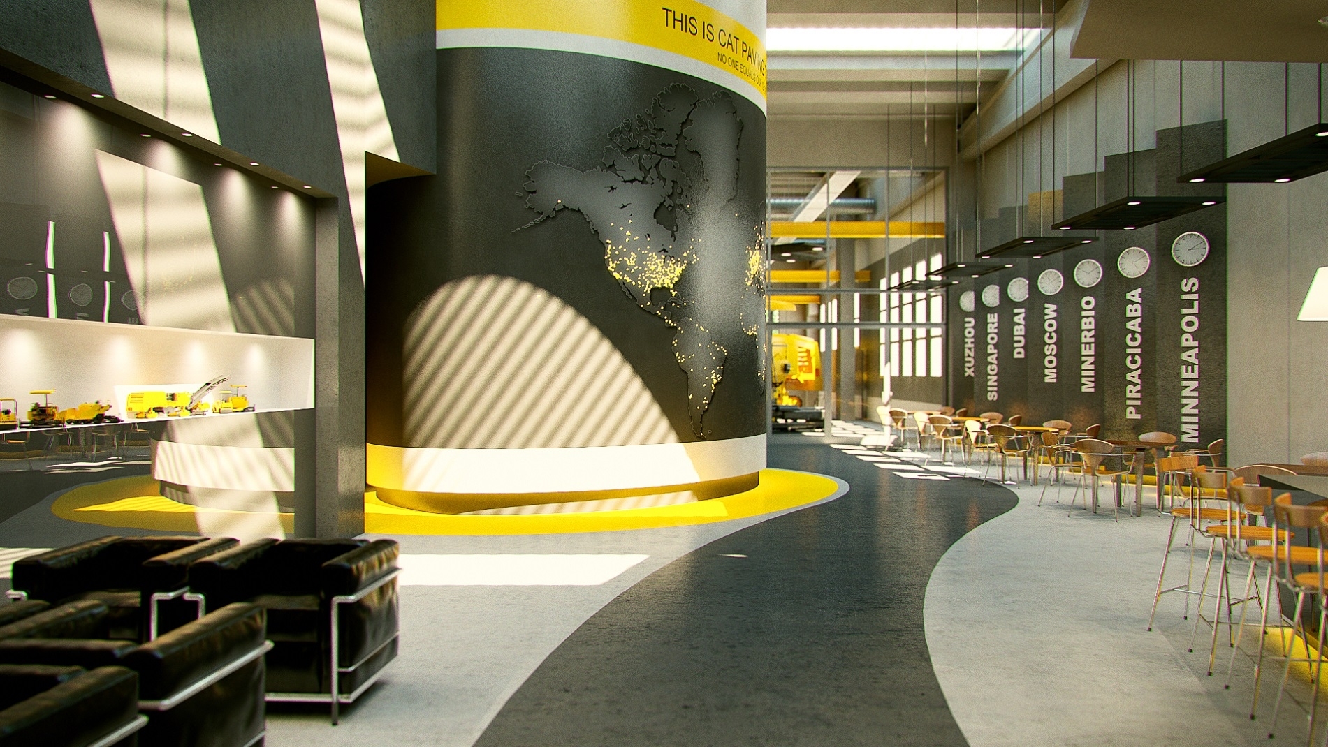 Il "concept" del nuovo Visitor's center CATERPILLAR per la sede di Minerbio, anticipa in modo dettagliato quelli che saranno i connotati della nuova struttura di rappresentanza di cui questa prestigiosa azienda intende dotarsi a breve.
