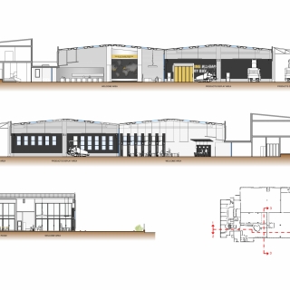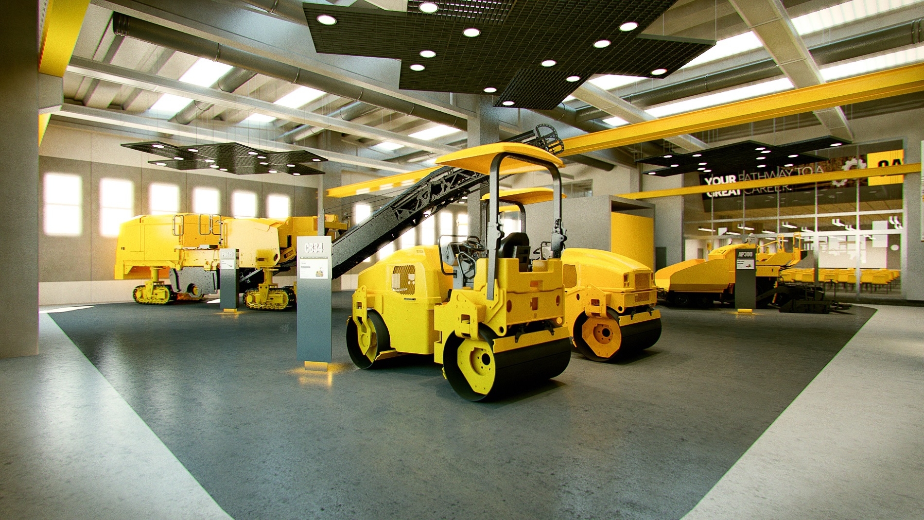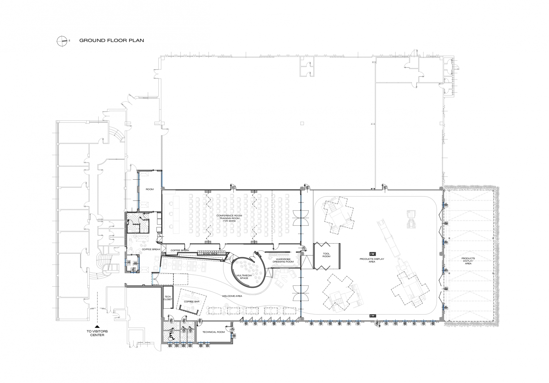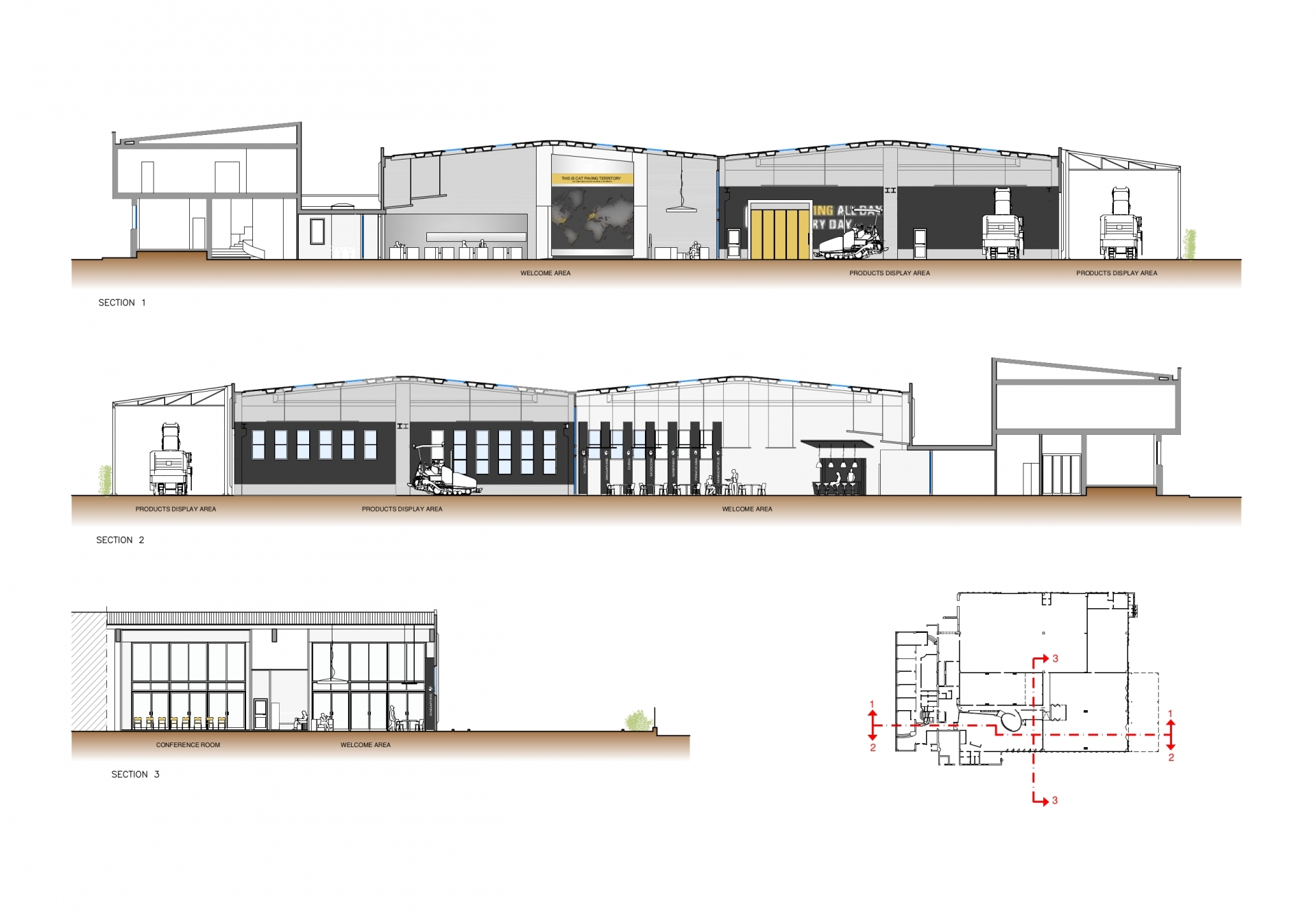 All'interno della nuova struttura saranno realizzati spazi "welcome", spazi "display" delle macchine e una capiente conference room frazionabile all'occorrenza in 3 aule training mediante pareti compattabili. Lo stesso spazio display è studiato per essere laboratorio di training quando non utilizzato come spazio espositivo.