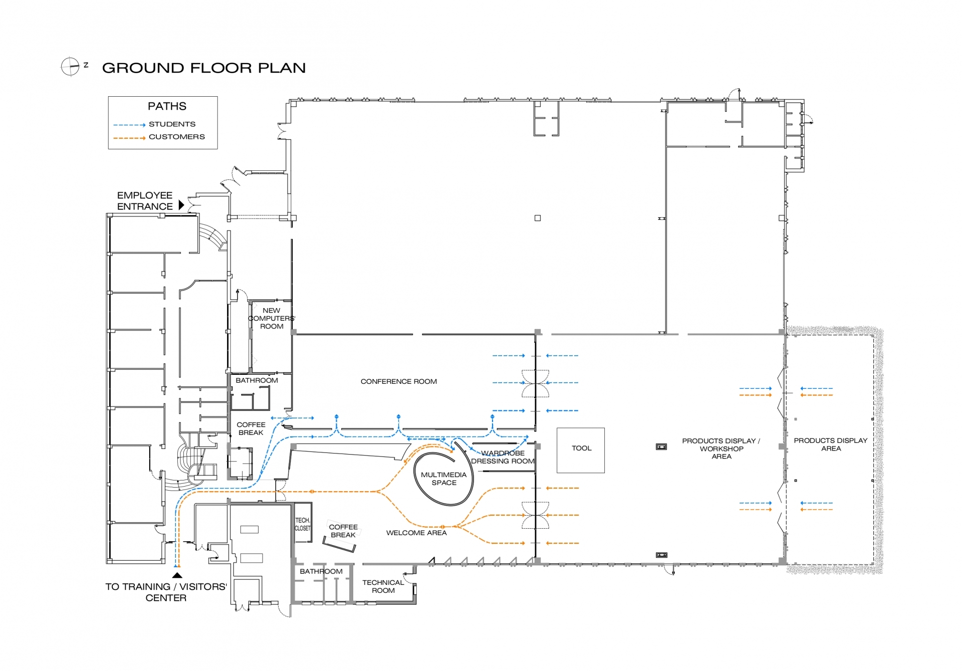 Il lay-out è stato pensato per rendere la nuova struttura usufruibile contemporaneamente sia dai visitatori che dagli studenti del training, mediante una distribuzione interna, che pur restando semplice nel proprio schema, non sovrappone i flussi e riserva ad entrambi dotazioni di servizio separate.