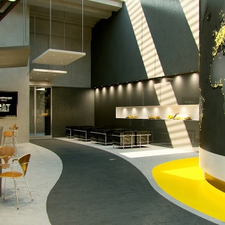 A fungere da "cerniera" tra le 3 funzioni principali, welcome, product display e training room, è uno spazio ellittico destinato ad esperienze multimediali complementari sia alla funzione training che alle presentazioni dei prodotti.