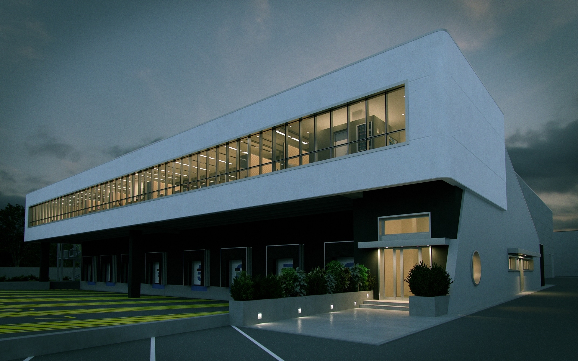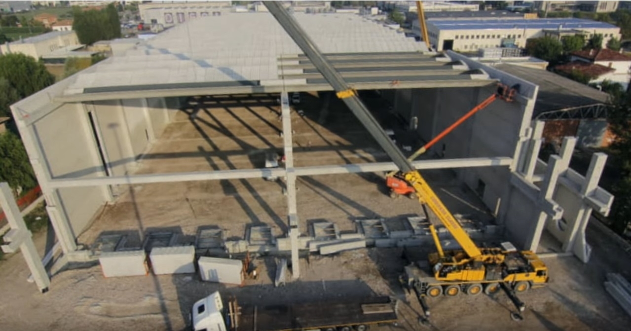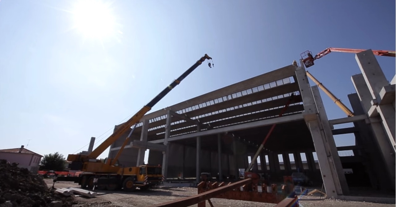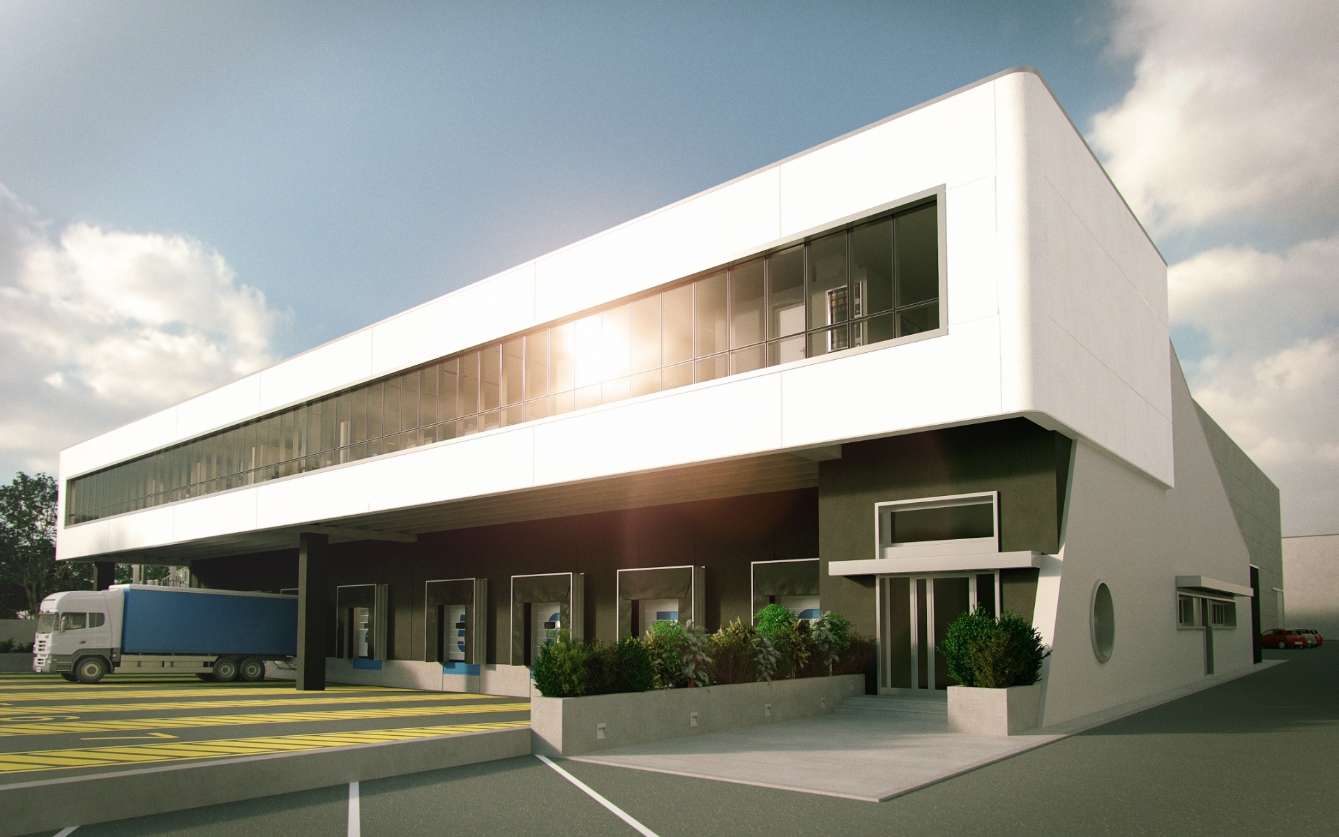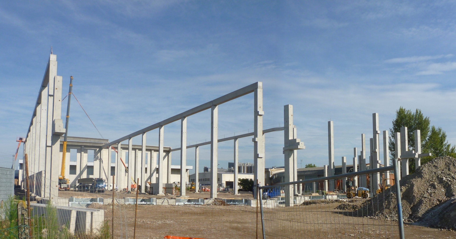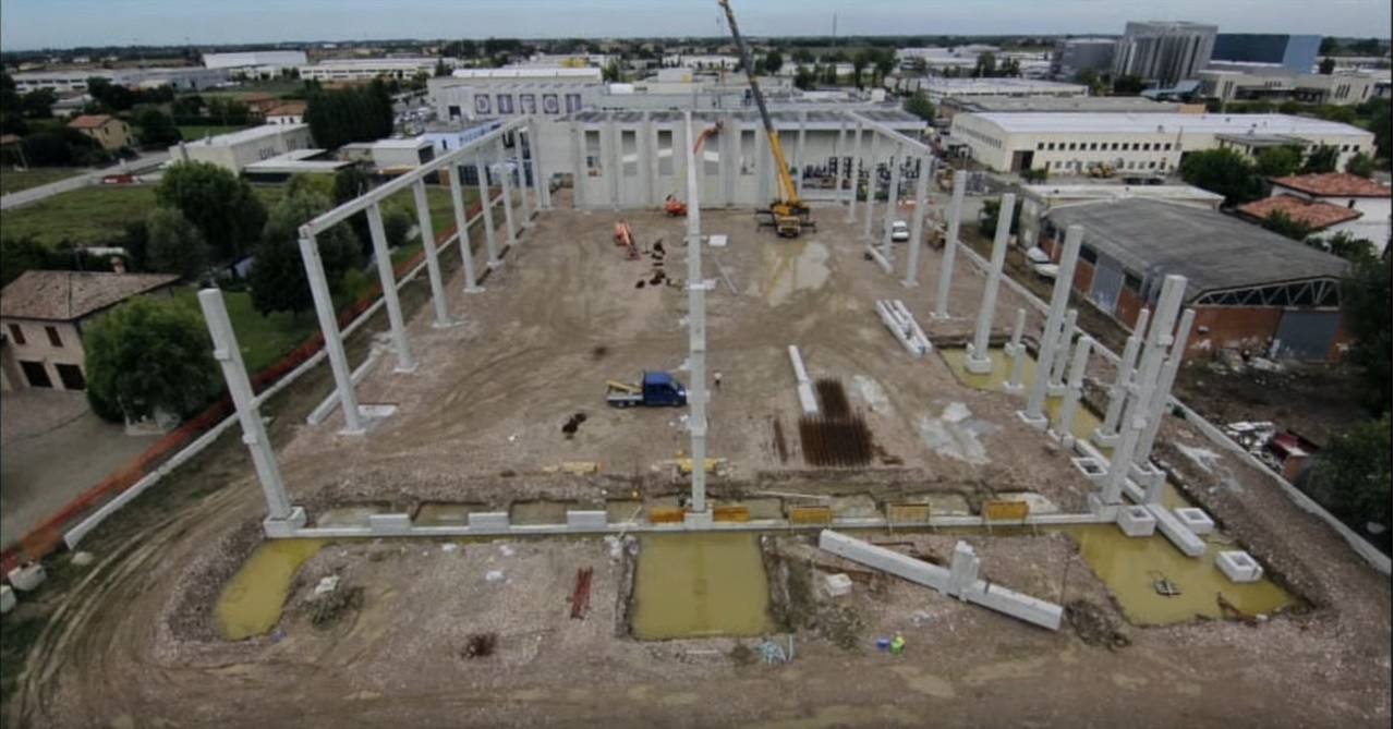 Realizzato con struttura in cemento armato precompresso alta 13 metri, il magazzino è dotato di un corpo laterale destinato ai servizi per il personale addetto. Sul fronte accessibile dalla viabilità pubblica, un grande piazzale permette l’ingresso e la manovra degli autotreni in avvicinamento alle bocche di carico. Tutta la zona di carico è coperta da un avancorpo posto al piano rialzato, avente un fronte di 50 metri e