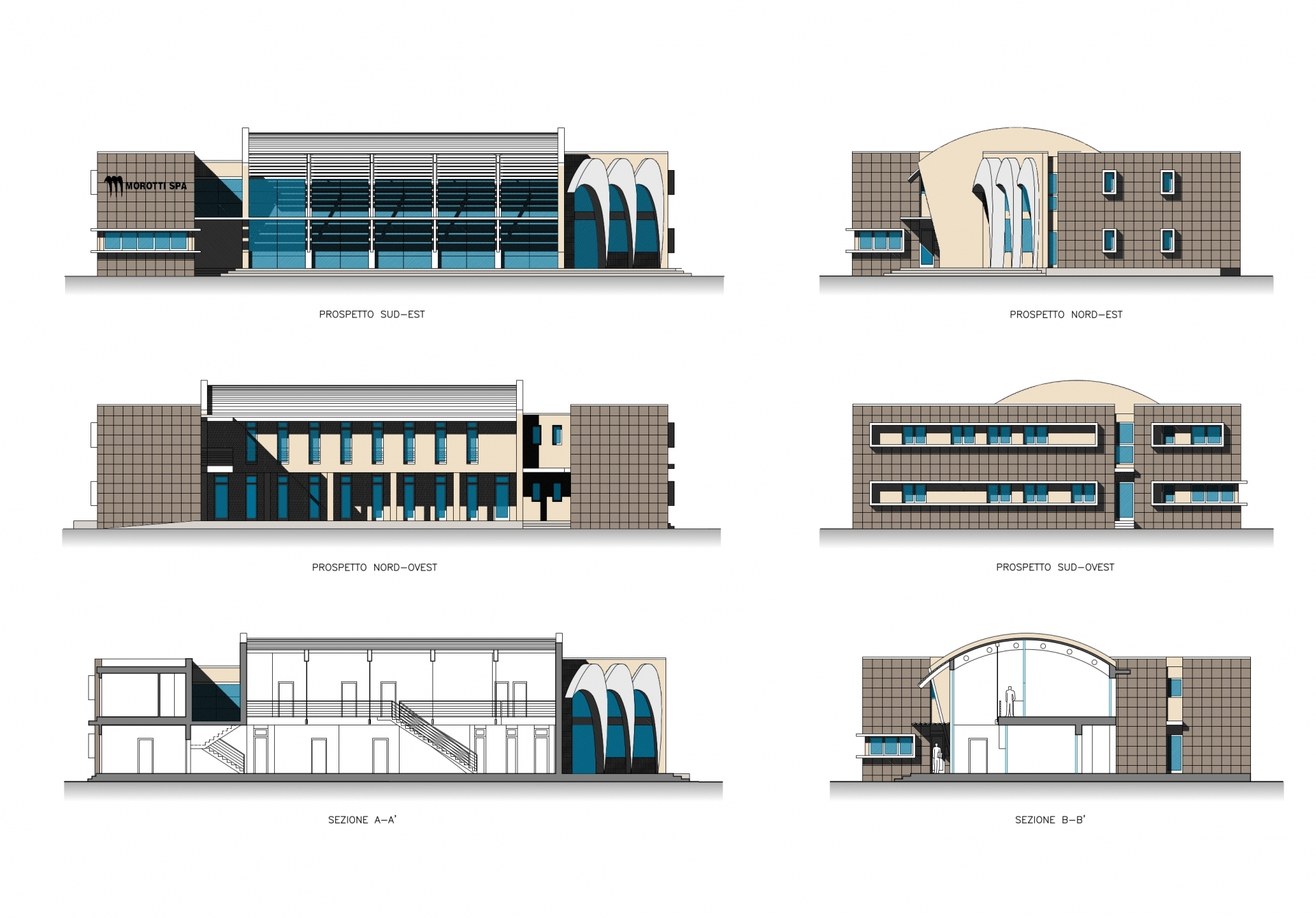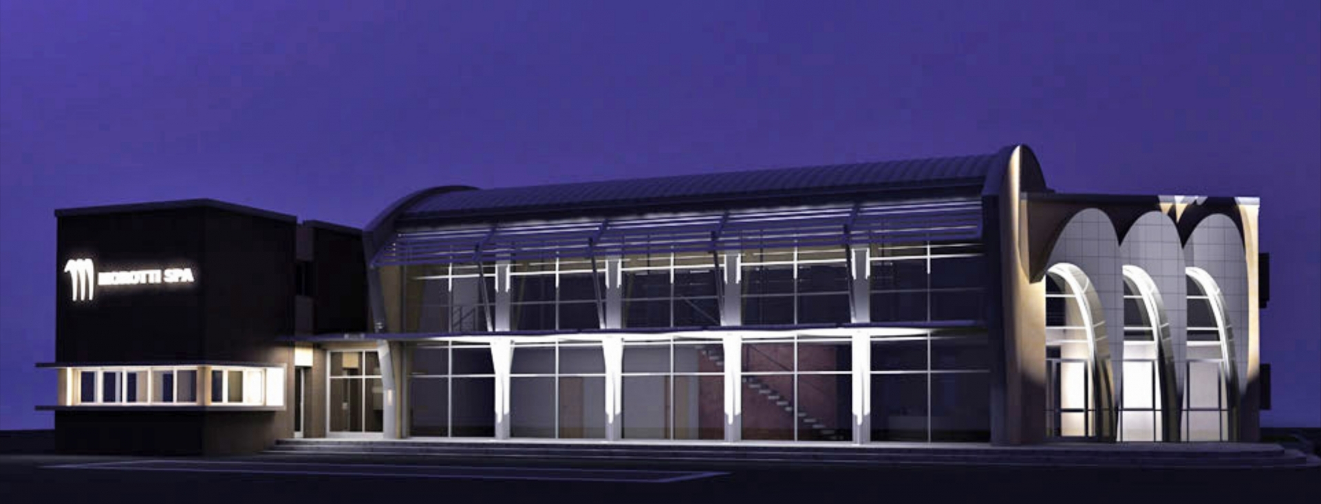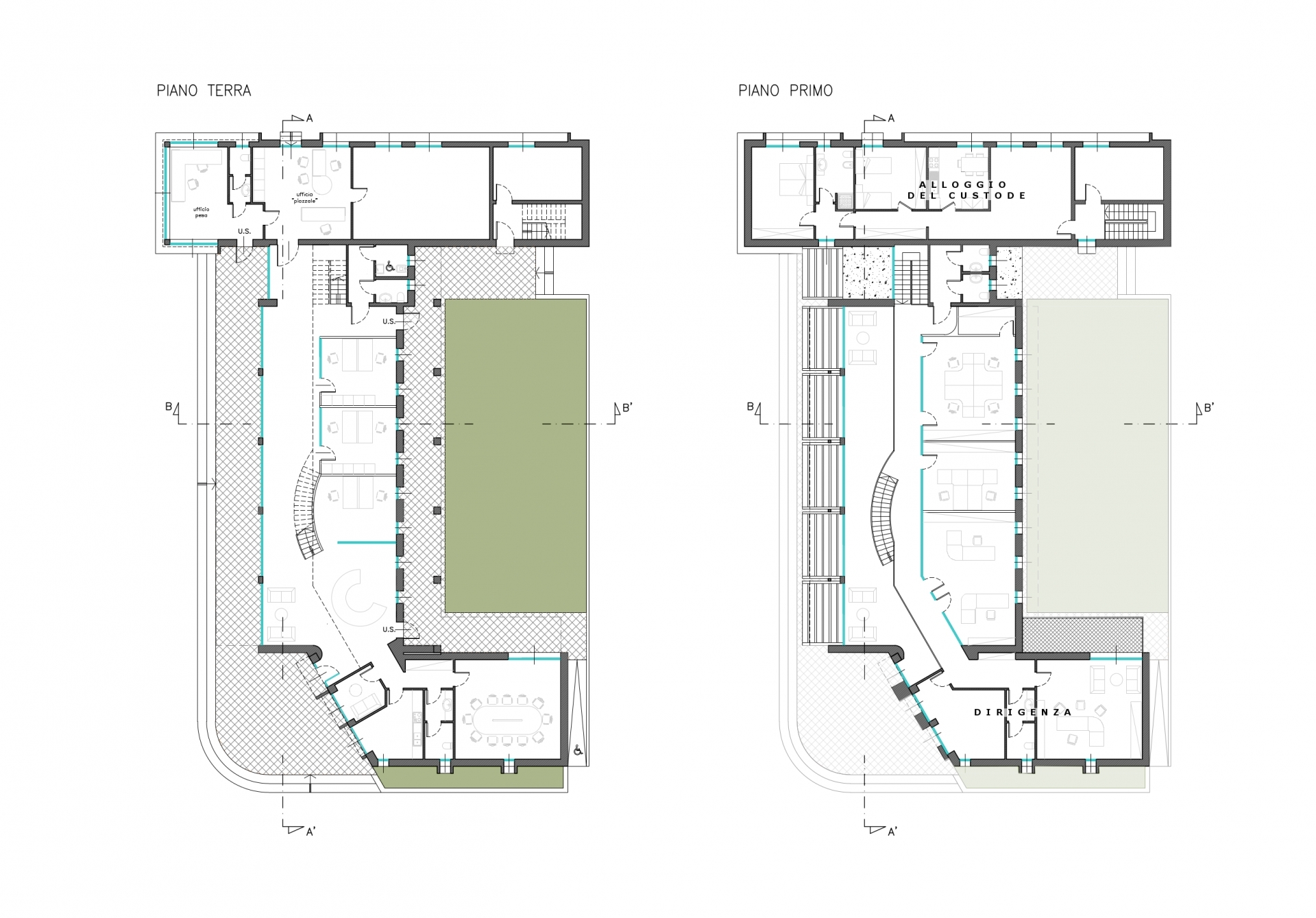 Nel corpo di fabbrica attestato sul parcheggio interno, sono ubicati l’ingresso riservato ai clienti e tutti gli uffici della dirigenza. Nel corpo centrale, la facciata interamente in vetro illumina un open space a doppio volume destinato ad accoglienza clienti; dalla scala a ventaglio si accede al piano superiore realizzato su un solaio metallico letteralmente appeso alla struttura ad arco della copertura. Un ballatoio affacciato sul doppio volume, dà accesso agli uffici amministrativi del piano primo, a loro volta affacciati sul giardino retrostante e quindi protetti dai rumori e dalle polveri originati dal piazzale.