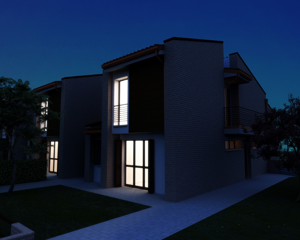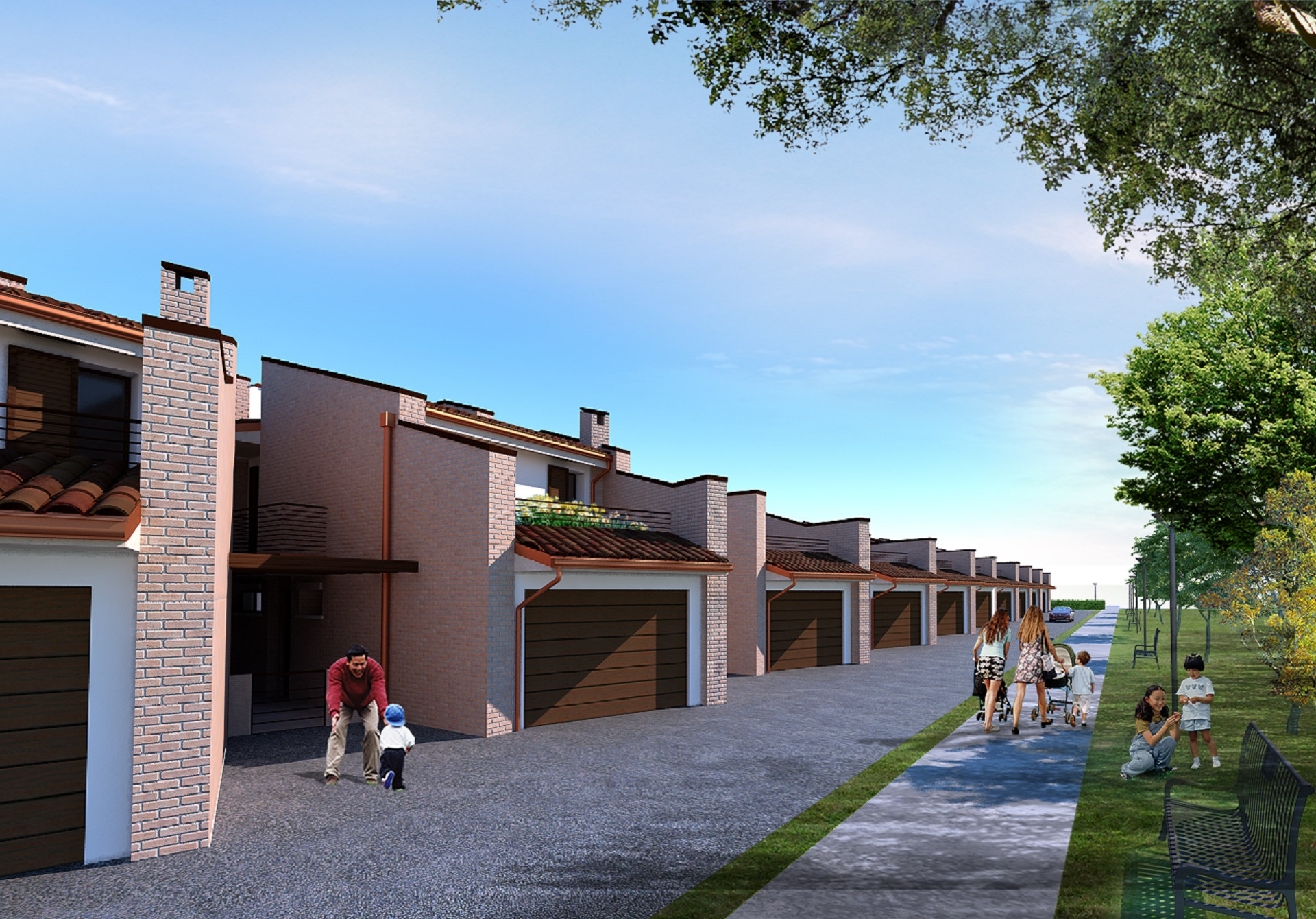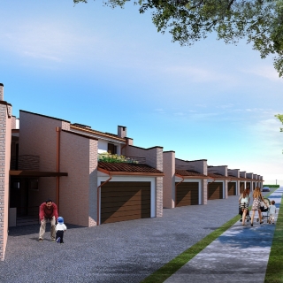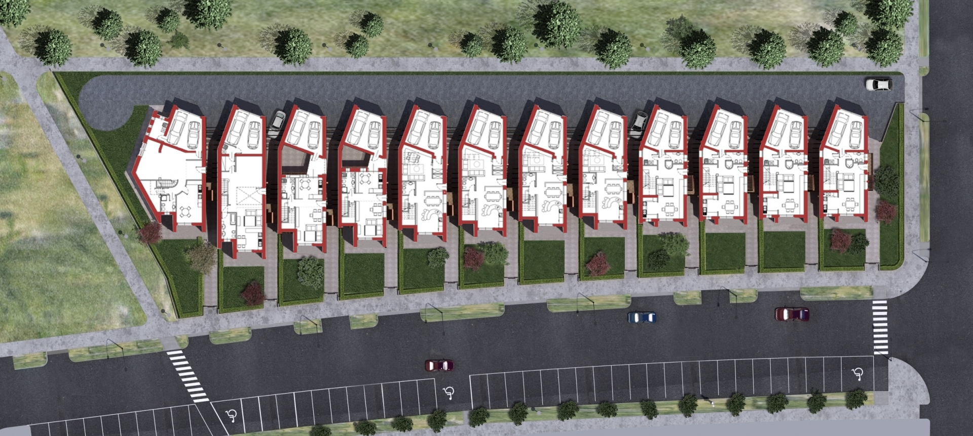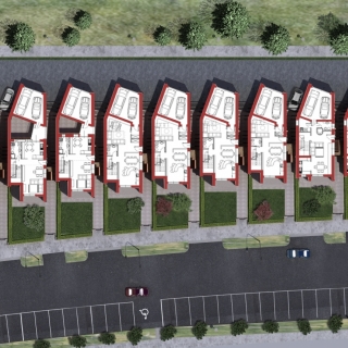 Progetto di 13 villini a schiera su lotto residenziale a geometria irregolare. L'obbligo urbanistico di allineare i fronti dei nuovi edifici ad una distanza predefinita dalla strada, unito all'esigenza della proprietà di utilizzare tutto il potenziale edificatorio, in un lotto a geometria trapezoidale hanno introdotto la necessità di realizzare una tipologia edilizia "tipo" sviluppabile su dimensioni crescenti.
