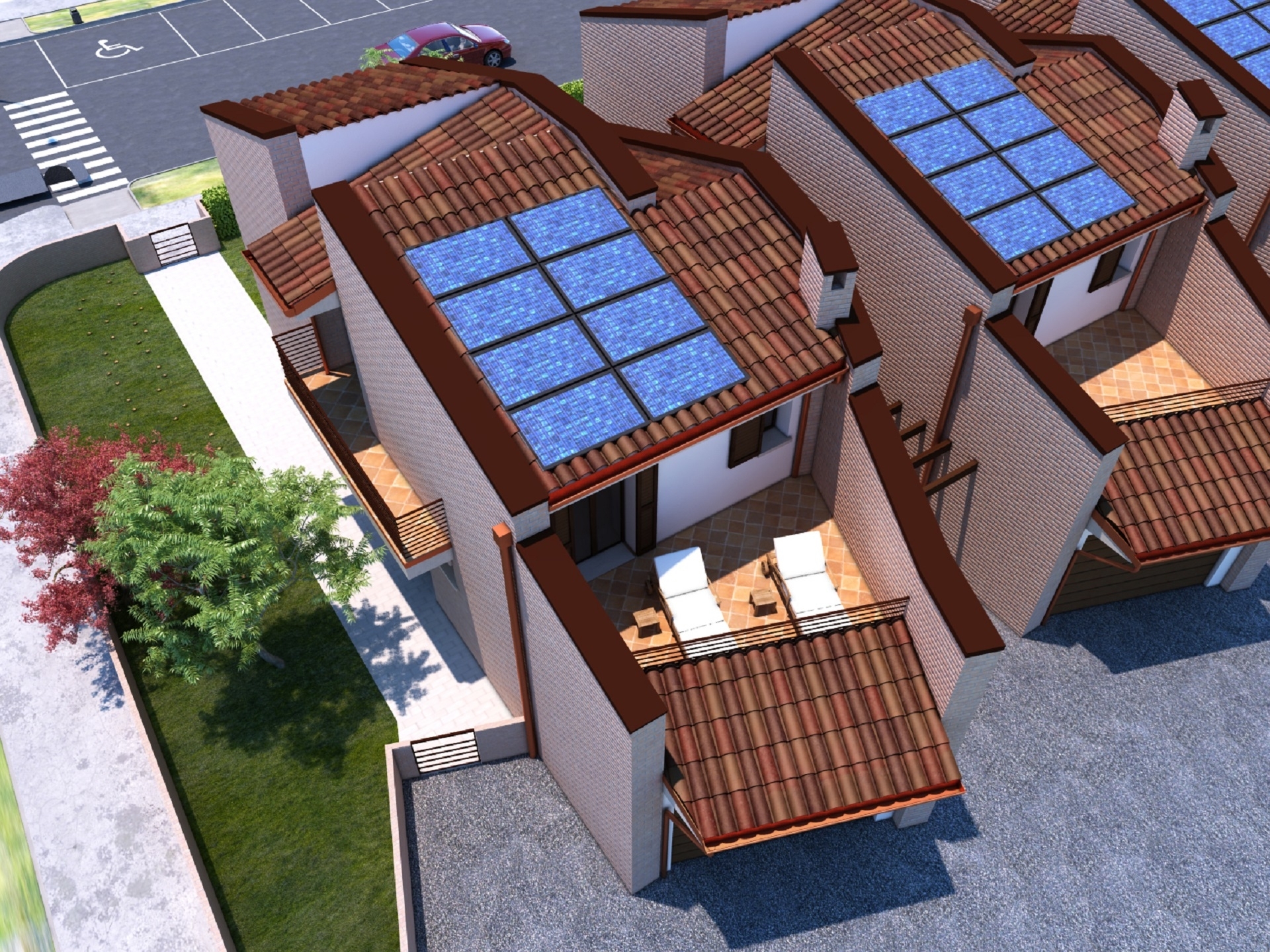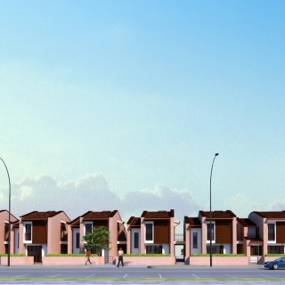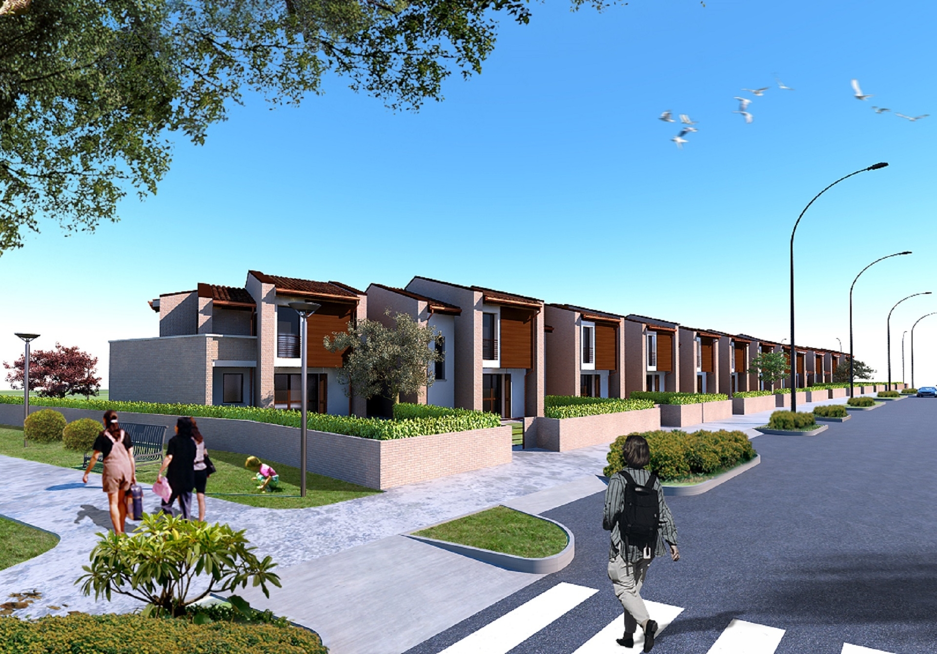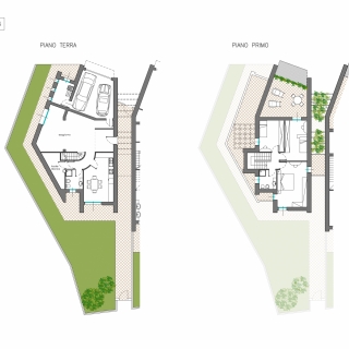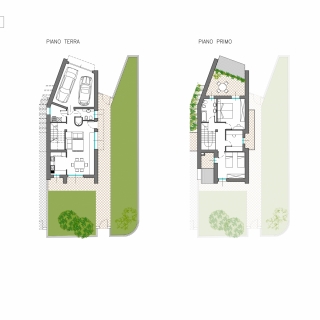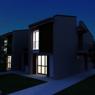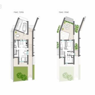 Progetto di 13 villini a schiera su lotto residenziale a geometria irregolare. L'obbligo urbanistico di allineare i fronti dei nuovi edifici ad una distanza predefinita dalla strada, unito all'esigenza della proprietà di utilizzare tutto il potenziale edificatorio, in un lotto a geometria trapezoidale hanno introdotto la necessità di realizzare una tipologia edilizia "tipo" sviluppabile su dimensioni crescenti.