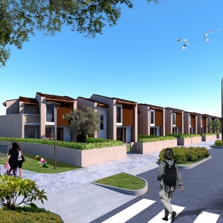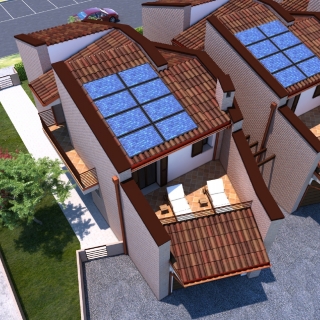 La particolarità del progetto sta nell'avere unito in un prospetto omogeneo ed ordinato, villini dai volumi molto diversi: per chi guarda il lotto dalla strada, tutti i villini presentano medesime proporzioni di facciata ma se si guarda il progetto in pianta, si capisce come essi siano in realtà differenti sia per distribuzione interna, sia per dimensioni. Partendo dall'estremità in cui il lotto è meno profondo si hanno i tagli più piccoli e procedendo verso il lato opposto dove il lotto si amplia in profondità, i moduli abitativi si allungano fino ad avere tipologie con patio interno e tipologie con doppi volumi interni. Tutti i villini, dal più piccolo al più grande, dispongono di doppia autorimessa, terrazzo solarium, ampia zona giorno, tre camere da letto.