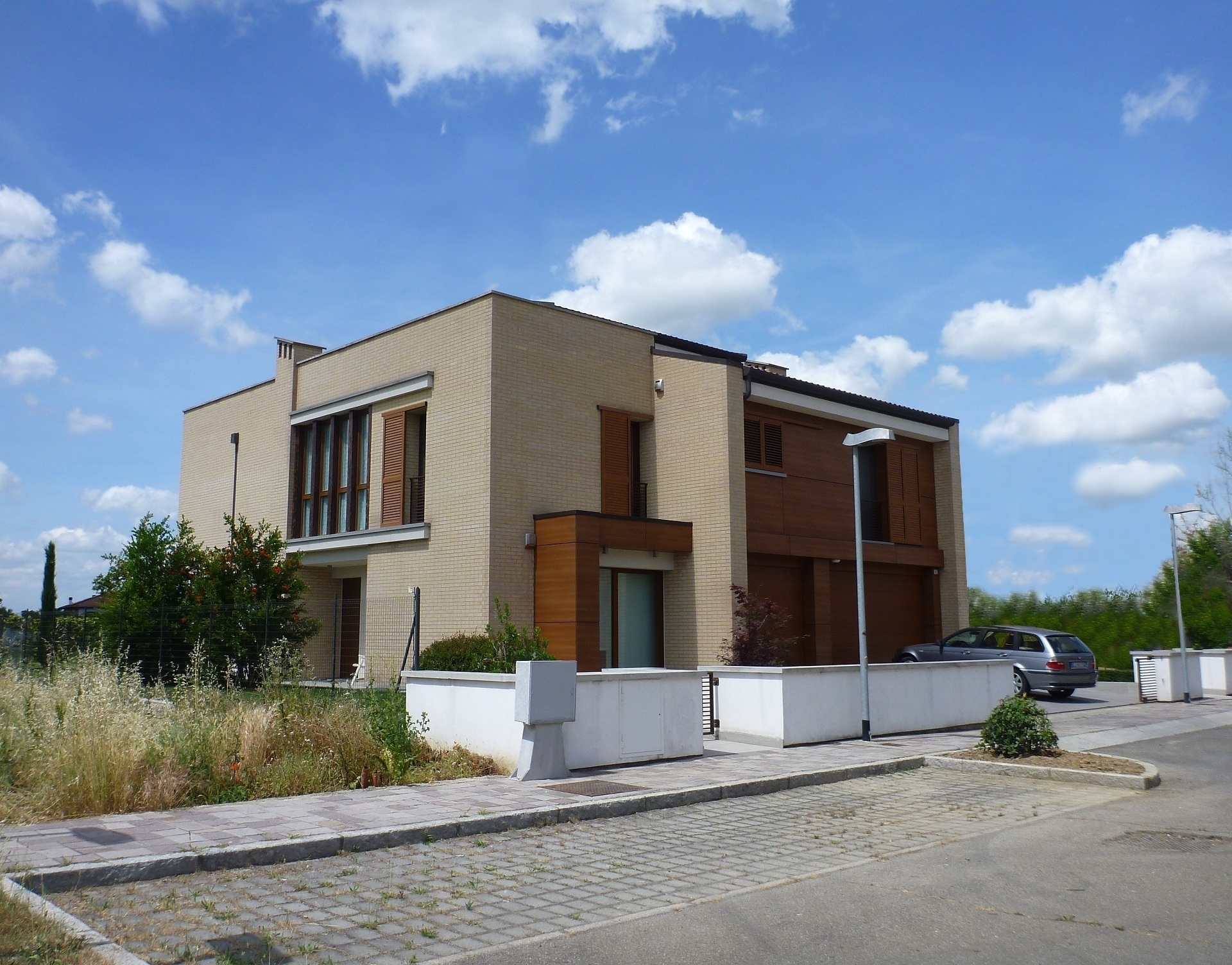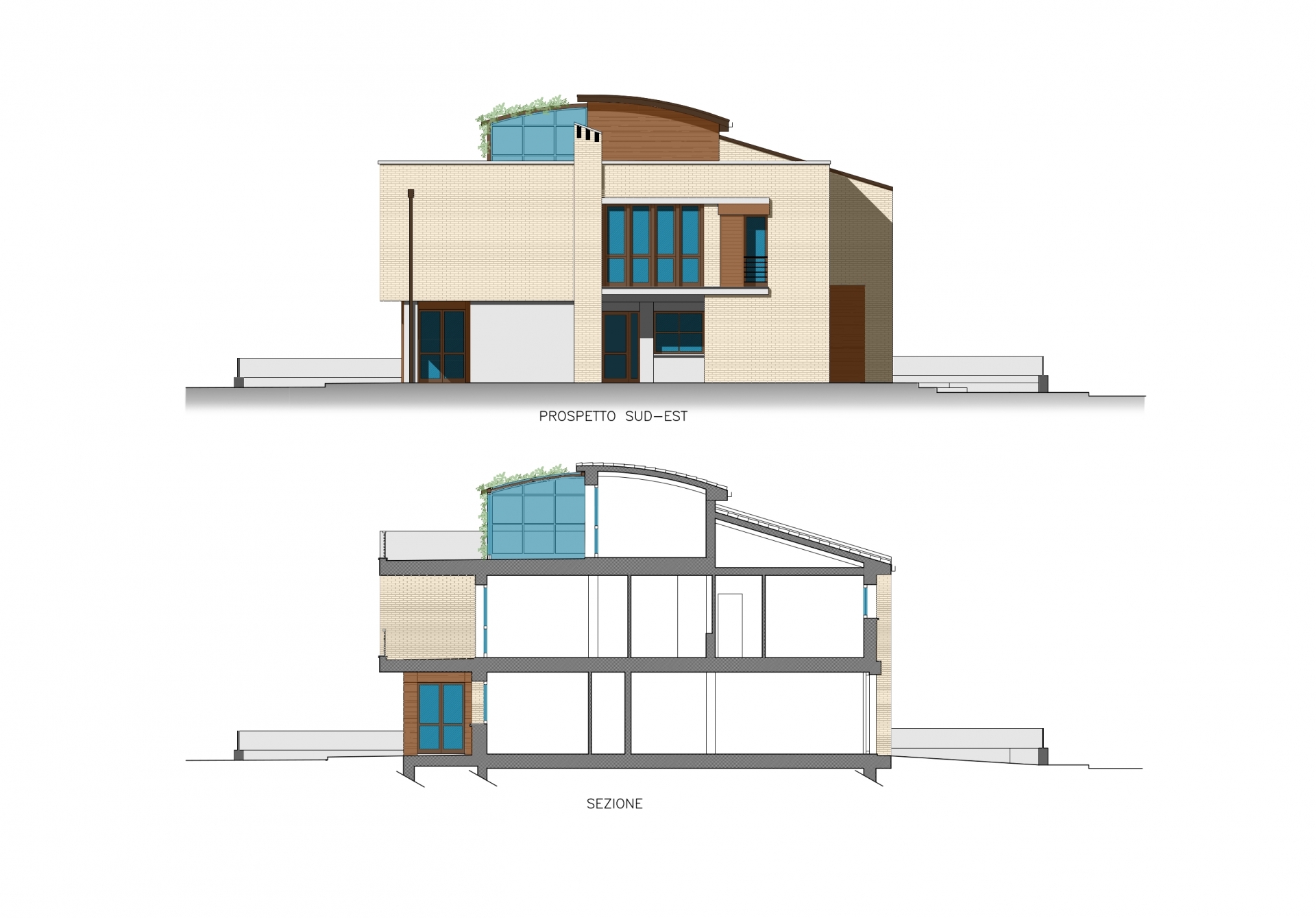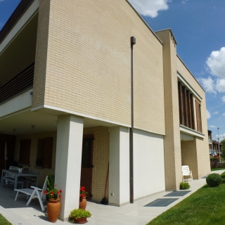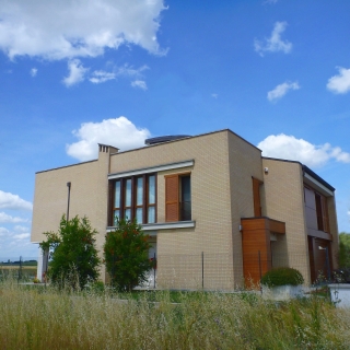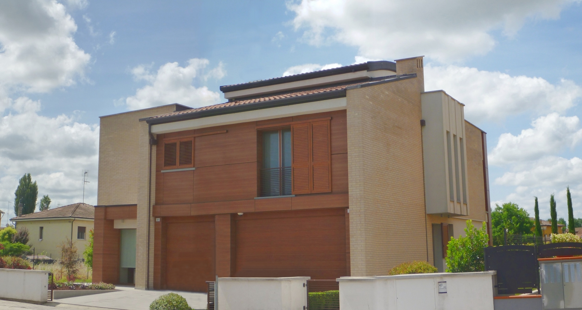 Villa privata abitata dal nucleo dei genitori e da quello del figlio, su lotto di nuova urbanizzazione. Forme squadrate abbinate al mattone facciavista colore giallo paglierino ne fanno un edificio orginale, in linea con il gusto dei proprietari, orientato verso forme contemporanee ma con un occhio alla tradizione. L'involucro è caratterizzato da ampie parti rivestite con pannellature Trespa effetto legno (ditta INPEK) montate su reticolato di ventilazione. Sul fronte nord-est, lato strada, i portoni sezionali di accesso alle autorimesse così come i sistemi oscuranti sono realizzati con materiali dallo stesso effetto legno utilizzato per i pannelli di rivestimento di facciata, nell'ambito della quale risultano mimetizzati fino a non farsi più percepire una volta chiusi. A questo fronte così "ermetico" orientato verso nord, si contrappone il fronte opposto, orientato verso la campagna, in direzione Sud-sudest, molto più permeabile, caratterizzato da un ampio porticato al piano terra e dal soprastante terrazzo coperto posto al piano primo, chiuso su 3 lati.