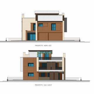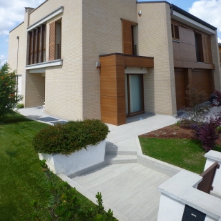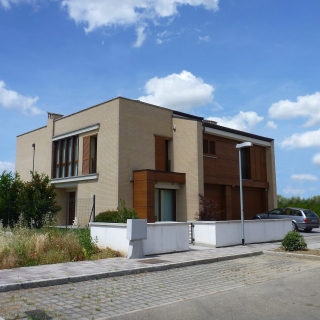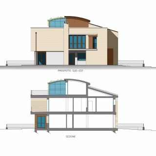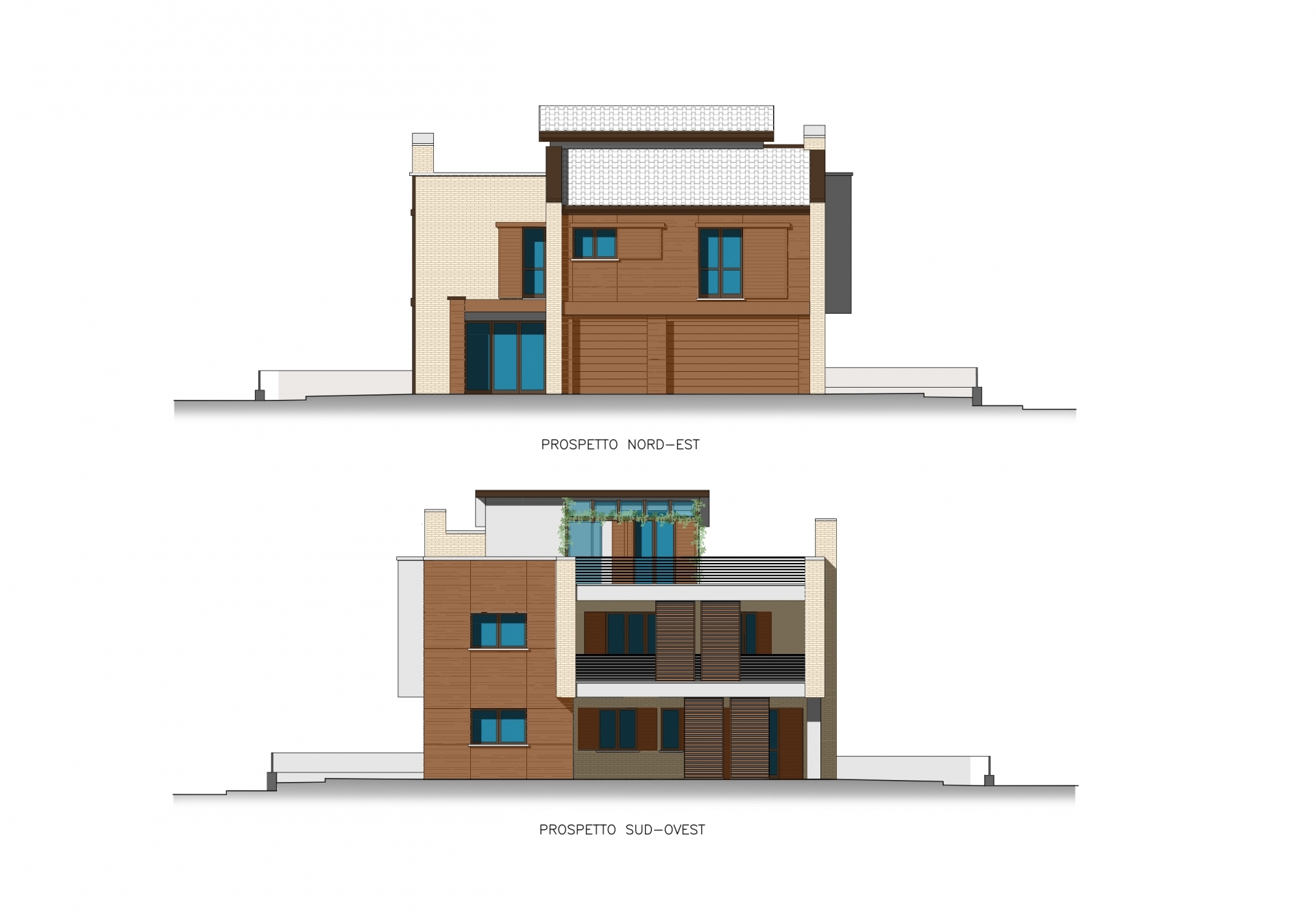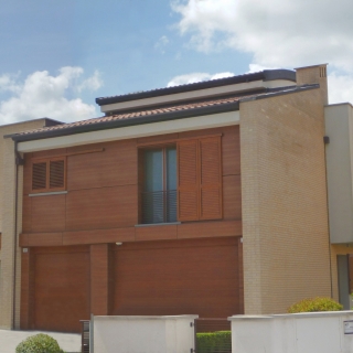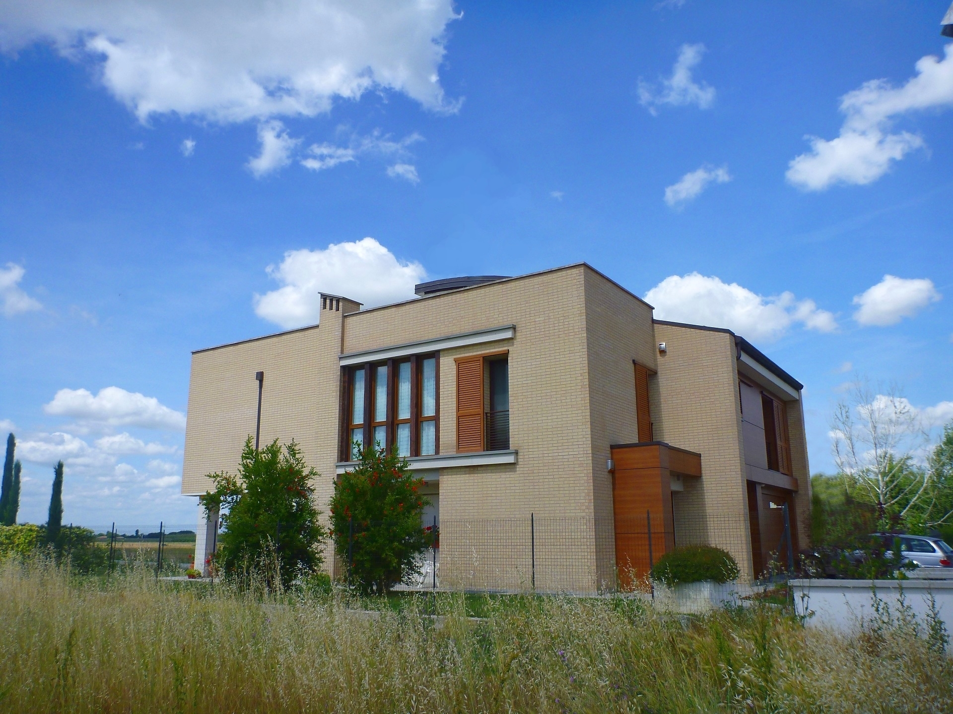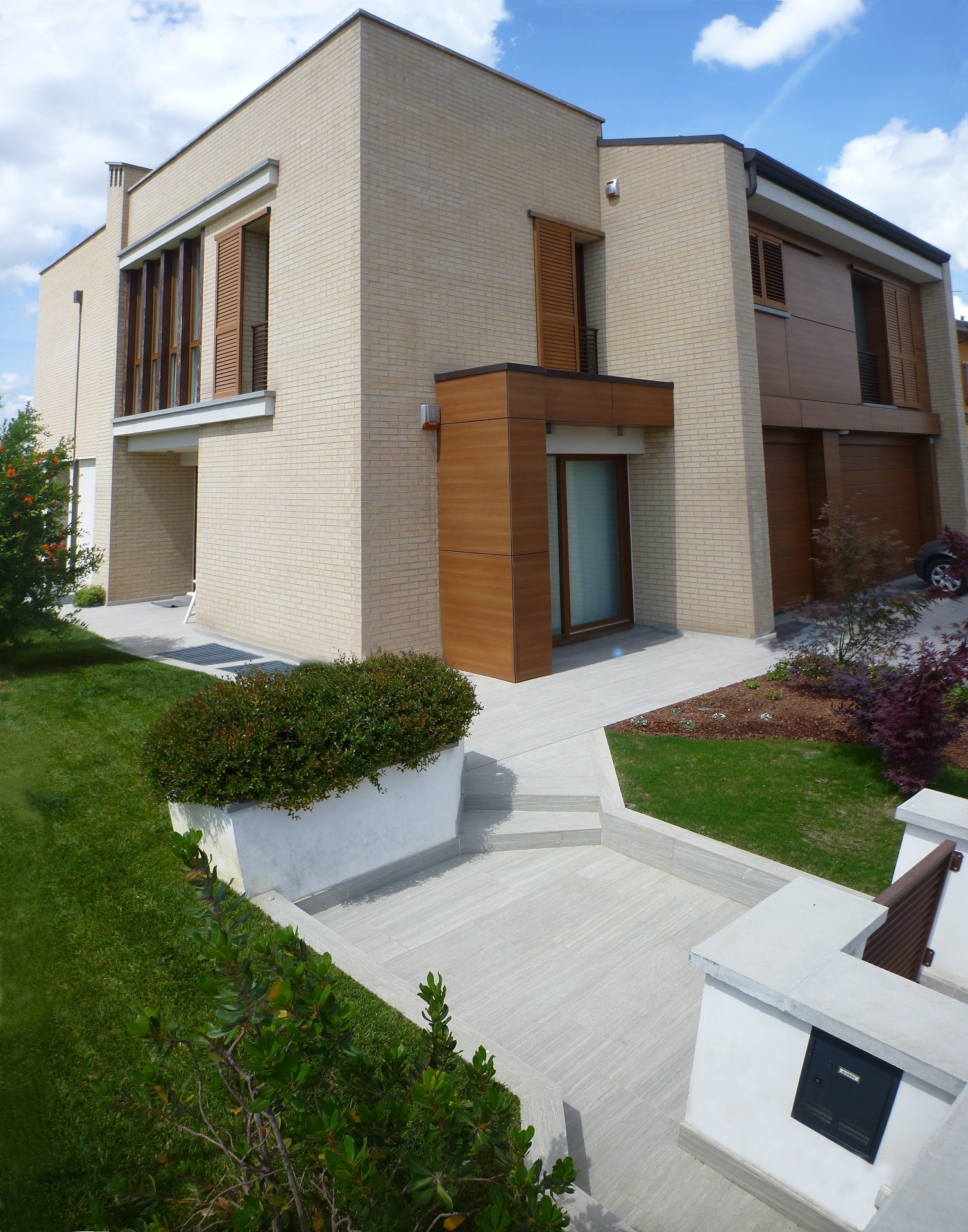 Villa privata abitata dal nucleo dei genitori e da quello del figlio, su lotto di nuova urbanizzazione. Forme squadrate abbinate al mattone facciavista colore giallo paglierino ne fanno un edificio orginale, in linea con il gusto dei proprietari, orientato verso forme contemporanee ma con un occhio alla tradizione. L'involucro è caratterizzato da ampie parti rivestite con pannellature Trespa effetto legno (ditta INPEK) montate su reticolato di ventilazione. Sul fronte nord-est, lato strada, i portoni sezionali di accesso alle autorimesse così come i sistemi oscuranti sono realizzati con materiali dallo stesso effetto legno utilizzato per i pannelli di rivestimento di facciata, nell'ambito della quale risultano mimetizzati fino a non farsi più percepire una volta chiusi. A questo fronte così "ermetico" orientato verso nord, si contrappone il fronte opposto, orientato verso la campagna, in direzione Sud-sudest, molto più permeabile, caratterizzato da un ampio porticato al piano terra e dal soprastante terrazzo coperto posto al piano primo, chiuso su 3 lati.