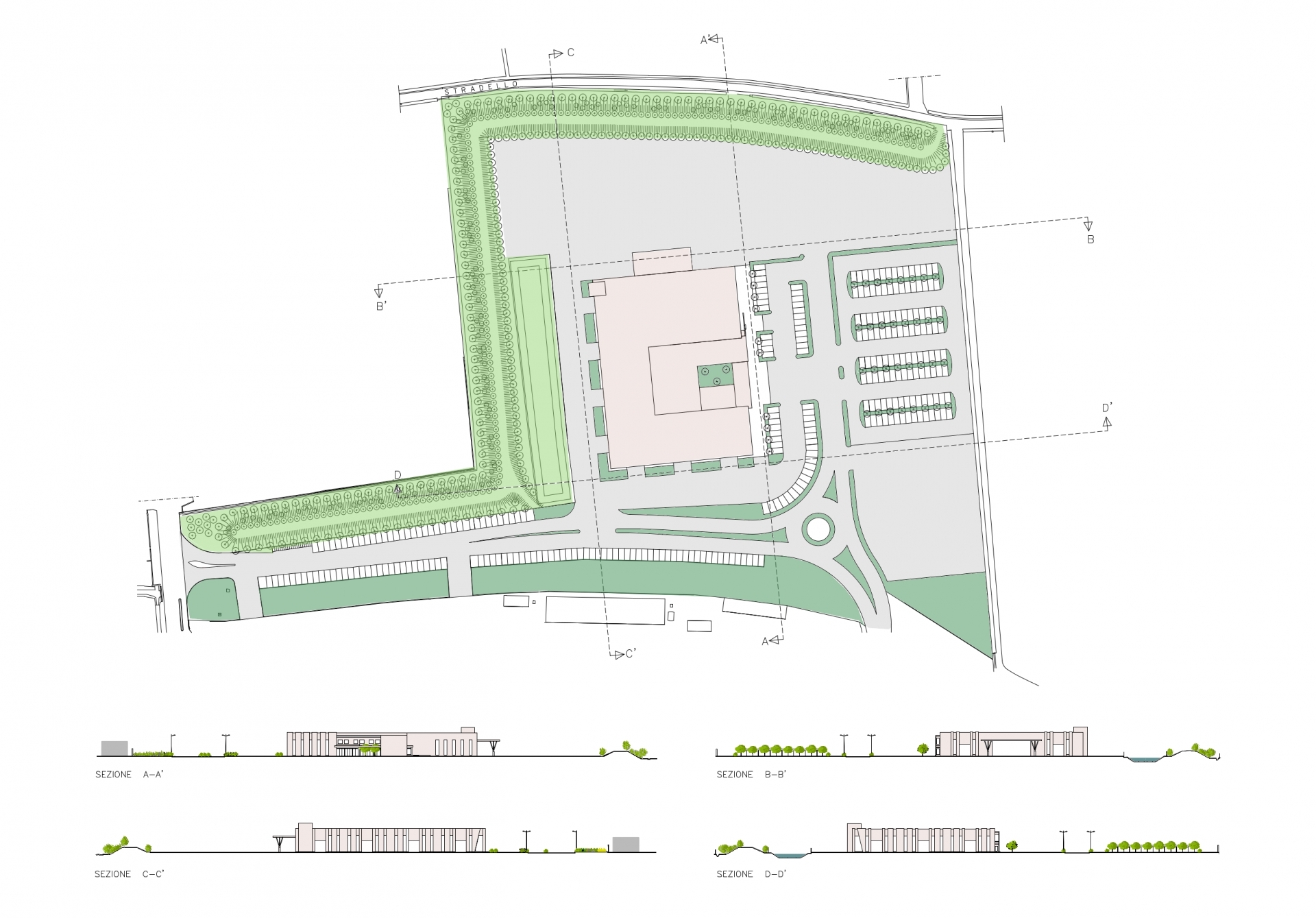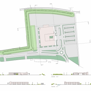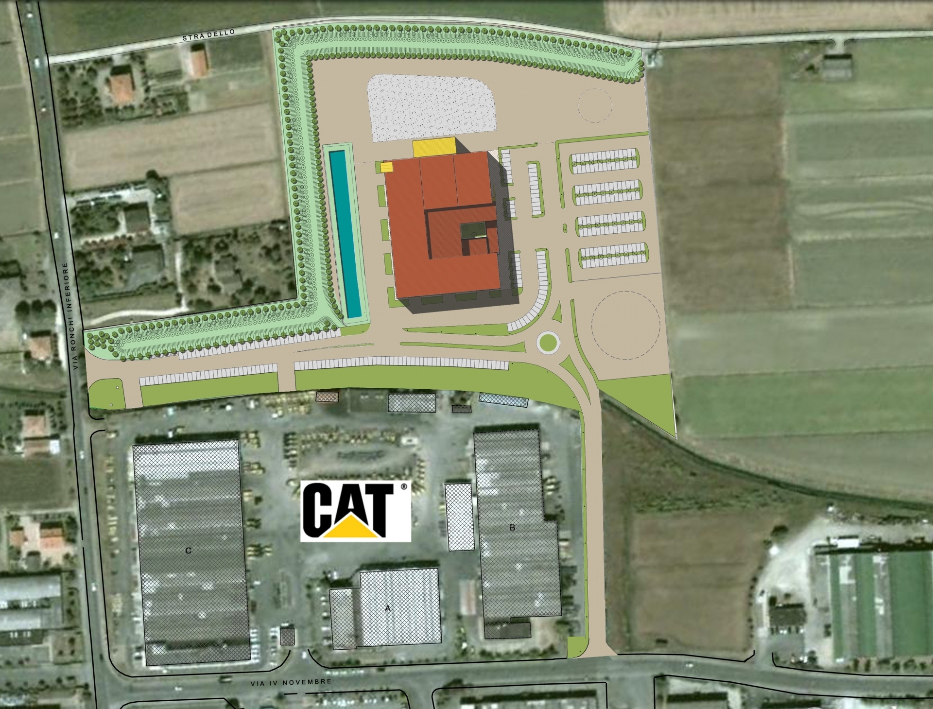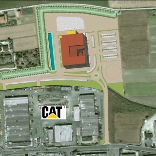 Il progetto di P.P.I.P qui presentato riguarda un'area di 5 Ha di supericie situata in adiacenza allo stabilimento CATERPILLAR SPA a Minerbio, prov. di BO. In precedenza il nostro studio aveva curato la stesura di un altro P.P.I.P. che prevedeva la suddivisione dell'area in 3 lotti edificabili per complessivi 18.000 mq di superficie edificabile ad usi produttivi. La prossimità con lo stabilimento CATERPILLAR SPA, unitamente ad alcune varianti urbanistiche introdotte dagli strumenti comunali, hanno indotto la proprietà a rinunciare al vecchio progetto per destinare l'intera superficie fondiaria al futuro ampliamento dello stabilimento adiacente. Il progetto contempla la costruzione di fasce verdi sui lati del comparto visibili dal centro abitato per complessivi 8000mq. di superficie; all'interno di queste "fasce" larghe 20 metri, il P.P.I.P. ha inserito la possibilità di realizzare terrapieni di 3 metri di altezza, continui, aventi funzione di mitigazione acustica, che oggi sono già stati realizzati e piantumati con centinaia di piante e arbusti. Parallelamente ad uno dei due lati interessati dal terrapieno, è stata progettata e già realizzata una vasca di laminazione quale opera di compensazione idraulica che permetterà, con il suo "polmone" di alcune migliaia di mc di invaso, di contenere le portate idrauliche allo scarico in pubblica condotta. Quindi, il verde come opera di mitigazione ambientale e un'opera idraulica importante a mitigazione dell'impatto del nuovo comparto sulle reti pubbliche, spesso provate da eventi meteorici sempre più violenti, fanno di questa urbanizzazione un'intervento di "basso impatto" sul territorio.